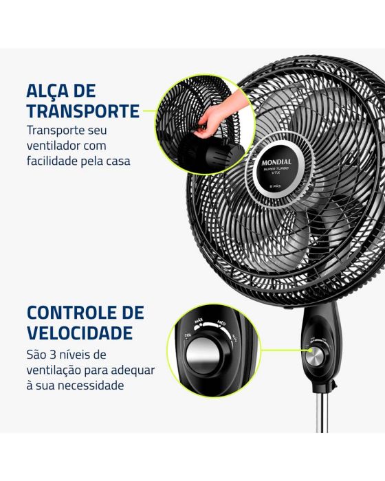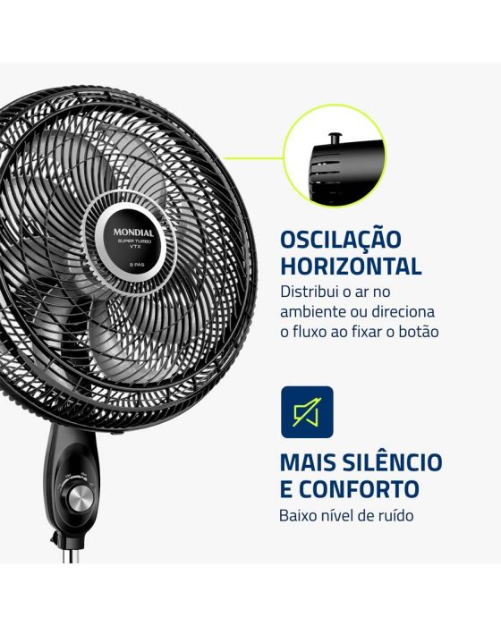 Características:O ventilador Super Turbo VTX-40C-8P possui 40 cm de diâmetro e hélice de 8 pás, o que promove uma circulação de ar mais eficiente e garante mais frescor ao ambiente. Com coluna ajustável entre 1,19 e 1,50 metros, o ventilador permite ajuste da altura do vento. Além disso, o sistema de ventilação alia a potência para refrescar ao baixo nível de ruído, proporcionando o silêncio necessário para uma excelente noite de sono.Detalhes:- Marca: Mondial;- Modelo: Super Turbo;- Referência: VTX-40C-8P;- Linha: Ventiladores;- Cor: Preto/Prata;- Tensão: 127V;- Tipo de instalação: Coluna;- Uso: Somente uso interno;- Contém: 1 unidade do produto;- Número de velocidades: 3 velocidades (mínimo, média e máxima);- Quantidade de pás: 8 pás;- Hélice com diâmetro de 40cm;- Grade frontal removível;- Inclinação vertical regulável;- Mais silêncio e conforto;- Sistema Oscilante.Diferenciais:- Super Turbo: Muito Mais Vento!: O 1° ventilador de 8 pás do Brasil! O design aerodinâmico e de alta performance do VTX Super Turbo proporciona maior intensidade do vento e melhor distribuição de ar. O resultado é um ambiente mais fresco e arejado!- Coluna Ajustável: Possui regulagem de 1,19 a 1,50 metros, permitindo o ajuste ideal da altura do vento;- Mais Silêncio e conforto: O sistema de ventilação alia a potência para refrescar ao baixo nível de ruído, proporcionando o silêncio necessário para momentos de concentração e uma excelente noite de sono;- Maior Distribuição de Ar: O Sistema Oscilante Contínuo amplia o raio de alcance do vento no ambiente, permitindo uma distribuição de ar mais eficiente nos cômodos da casa;- Inclinação Vertical Regulável: Para um direcionamento ideal do fluxo do ar;- Controle de Velocidade: As 3 opções de velocidade permitem adequar o vento à sua necessidade: Máxima Turbo, Média Conforto e Mínima Silencioso;- Facilidade na Limpeza: A grade frontal removível oferece mais facilidade na limpeza das hélices, o que simplifica a lavagem e a remoção de poeira, e garante melhor qualidade do ar;- Alça de Transporte + Porta-Fio: Além do design compacto, a alça traseira permite que o ventilador seja transportado entre os cômodos da casa com facilidade. Com o porta-fio embutido, você armazena o fio elétrico dentro do aparelho após o uso.Energia:- Tensão: 127V;- Potência: 140W.Medidas:- Dimensões do produto montado: 50 x 47,5 x 150cm (CxLxA);- Dimensões da embalagem: 48,9 x 27,9 x 50,7cm (CxLxA);- Peso: 5,7kg.Conteúdo da embalagem: 1 ventilador de Coluna Super Turbo VTX-40C-8P Mondial e 1 manual de instruções.Garantia do fornecedor: 1 ano contra defeitos de fabricação.* As especificações podem ser alteradas sem aviso prévio ** Imagem meramente ilustrativa.