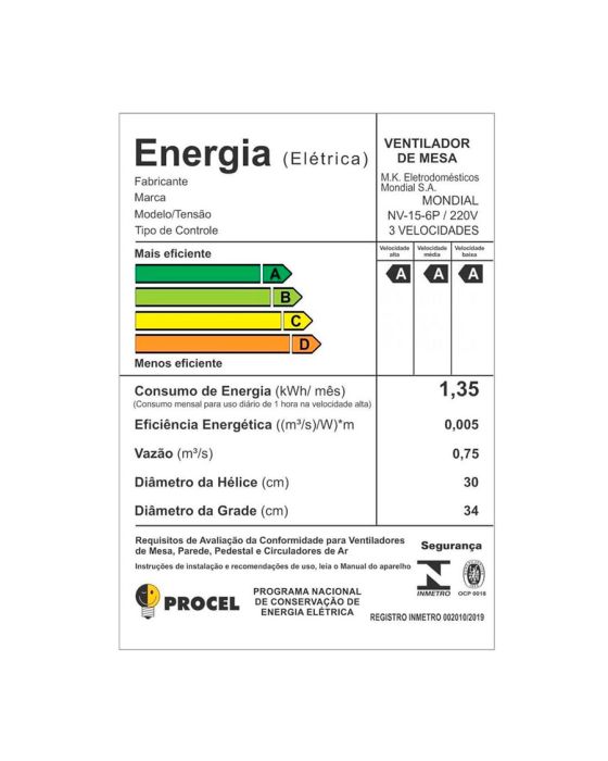 Características:Com 30cm e 3 velocidades, o Ventilador branco Maxi Power NV-15-6P é mais vento. Ele tem Baixo Nível de Ruído, Sistema Oscilante lateral, Inclinação Vertical Regulável, além ser compacto e ter baixo consumo. Sua Hélice tem design aerodinâmico, o que proporciona um vento forte. Como ele faz menos barulho, com qualquer uma das 3 velocidades, você dorme com ventinho e silêncio garantidos. Para ambientes mais amplos, você pode usar seu sistema oscilante.Detalhes:- Marca: Mondial;- Modelo: Maxi Power;- Referência: NV-15-6P;- Linha: Ventiladores;- Cor: Branco;- Tensão: 220V;- Potência: 50W;- Tipo de instalação: Mesa;- Contém: 1 unidade do produto;- Número de velocidades: 3 velocidades (mínimo, média e máxima);- Quantidade de pás: 6 pás;- Hélice com diâmetro de 30cm;- Diâmetro da grade: 34cm;- Grade plástica frontal removível;- Produto versátil, instalação de mesa ou coluna;- Inclinação vertical regulável;- Silencioso;- Sistema Oscilante.Energia:- Tensão: 127V;- Potência: 50W;- Consumo de energia (kWh/mês): 1,35;- Vazão (m3/s): 0,75;- Classificação energética: A.Medidas:- Dimensões do produto: 35 x 28 x 51cm (CxLxA);- Peso: 1,6kg.Conteúdo da embalagem: 1 ventilador Mondial Maxi Power NV-15-6P, 1 manual de instruções e 1 Manual de Assistência Técnica.Garantia do fornecedor: 1 ano contra defeitos de fabricação.* As especificações podem ser alteradas sem aviso prévio ** Imagem meramente ilustrativa.
