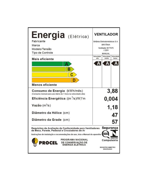Características:Diga adeus aos dias quentes com o Ventilador de Parede Britânia Maxx Force 176W BVT575! São 176W de potência e tecnologia Maxx Force, com 6 pás de 47cm que, juntos, garantem altíssimo desempenho e poder de ventilação.Além disso, não vai faltar praticidade no momento da limpeza do seu Ventilador. Ele é muito fácil para montar, desmontar e limpar, pois conta com grade de 57cm e total flexibilidade.Sem falar que o Ventilador Britânia é equipado com sistema de articulação que permite o ajuste em 3 opções de oscilação vertical e oscilação horizontal automática.O Ventilador de parede Britânia BVT575 foi desenvolvido com motor que possui sistema que interrompe o funcionamento do produto quando há superaquecimento.O clima perfeito nos dias mais quentes!Detalhes:- Marca: Britânia;- Modelo: Maxx Force;- Referência: BVT575;- Linha: Ventiladores;- Cor: Preto;- Tensão: 220V;- Potência: 176W;- Tipo de instalação: De parede;- Contém: 1 unidade do produto;- Número de velocidades: 3 velocidades (suave, moderada e intenso);- Quantidade de pás: 6 pás;- Hélice com diâmetro de 47cm;- Grade com diâmetro de 57cm;- Grade Plástica frontal removível;- Hélice turbina;- Grande vazão de ar;- Motor com fusível térmico.Energia:- Tensão: 220V;- Potência: 176W;- Vazão: 1,18 m3/s;- Eficiência Energética (m3/s)W)*m: 0,004;- Consumo de energia (kWh/mês): 3,88;- Classificação energética: Velocidade Alta: B Velocidade Média: A Velocidade Baixa: A.Medidas:- Dimensões do produto: 40,3 x 57 x 57cm (CxLxA);- Dimensões da embalagem: 56,6 x 15,1 x 72,5cm (CxLxA);- Peso do produto: 3,516kg;- Peso da embalagem: 4,243kg.Conteúdo da embalagem: 1 ventilador Britânia Maxx Force BVT575 e 1 manual de instruções.Garantia do fornecedor: 1 ano contra defeitos de fabricação.* As especificações podem ser alteradas sem aviso prévio ** Imagem meramente ilustrativa.