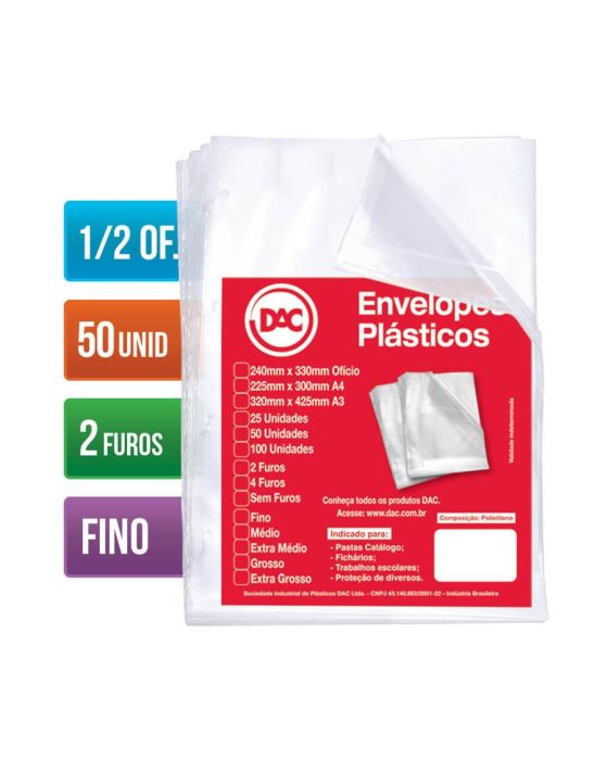 Envelope Plastico 1/2 Oficio Fino C/2 Furos 6 Micras C/50 Ref 5192 Dac