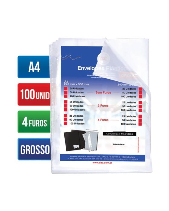 Envelope Plastico A4 Grosso C/4 Furos 15 Micras C/100 Ref 5076 Dac
