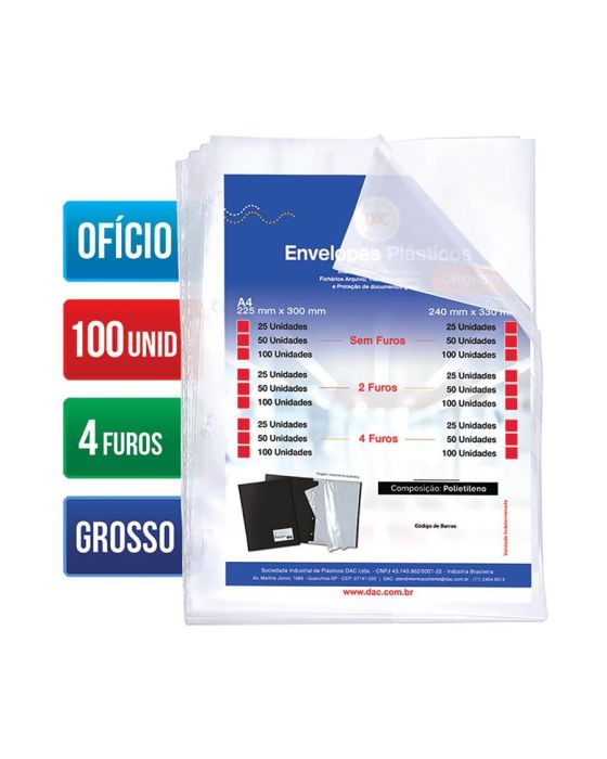 Envelope Plastico Oficio Grosso C/4 Furos 15 Micras C/100 Ref 5076 Dac