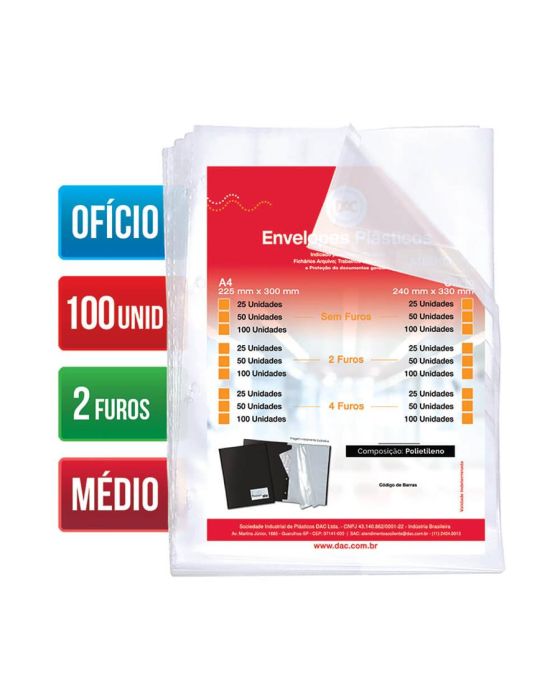 Envelope Plastico Oficio Medio C/2 Furos 10 Micras C/100 Ref 5079 Dac