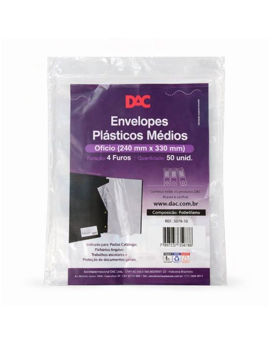 Características:- Envelope plástico ofício médio com 4 furos em polietileno para proteção e organização de documentos: O Envelope Plástico Ofício Médio DAC 5870-50 foi desenvolvido para armazenar e proteger documentos com praticidade e segurança. Produzido em polietileno transparente, permite fácil visualização do conteúdo, preservando contra sujeira, umidade e desgaste no manuseio diário.- Praticidade no uso com perfuração padrão para fichários e pastas: Possui 4 furos com espaçamento padrão de 7,4 cm, sendo compatível com pastas catálogo e fichários. O formato facilita o arquivamento e organização de documentos sem necessidade de perfuração adicional.- Material resistente com transparência e durabilidade: Fabricado em polietileno, oferece boa resistência mecânica e flexibilidade, garantindo maior durabilidade. Seu acabamento incolor mantém a legibilidade dos documentos, ideal para uso frequente.- Indicado para organização, arquivamento e proteção de documentos: Recomendado para uso em escritórios, escolas e ambientes corporativos, sendo ideal para trabalhos escolares, arquivos administrativos, relatórios e documentos em geral.- Sobre a marca DAC: A DAC é reconhecida no segmento de papelaria e organização por oferecer produtos funcionais, duráveis e com excelente custo-benefício, atendendo necessidades escolares e corporativas.- Dimensões da embalagem:Comprimento: 33cm;Largura: 24,4cm;Altura: 0,1cm;Peso: 677g.* As especificações podem ser alteradas sem aviso prévio ** Imagem meramente ilustrativa.