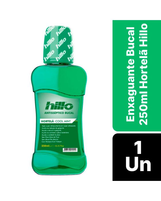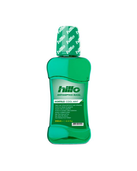 Características:- Enxaguante bucal antisséptico com ação refrescante e proteção diária: O Enxaguante Bucal Hortelã Hillo 250 ml foi desenvolvido para complementar a higiene bucal diária com ação antisséptica eficaz e sensação prolongada de frescor. Sua formulação atua no controle das bactérias responsáveis pelo mau hálito e pela formação da placa bacteriana, contribuindo para uma boca mais limpa e protegida ao longo do dia.- Frescor intenso de hortelã com uso confortável: Com sabor marcante de hortelã, o produto proporciona hálito fresco sem causar ardência. A fórmula sem álcool e sem flúor é adequada para o uso diário, oferecendo limpeza eficiente com maior conforto, inclusive para usuários com sensibilidade bucal.- Auxílio na saúde gengival e prevenção de problemas bucais: Indicado para a rotina diária, o enxaguante auxilia na redução da gengivite, no combate à placa bacteriana e na prevenção do mau hálito. A presença de triclosan potencializa a ação antisséptica, reforçando a proteção contra micro-organismos nocivos à saúde bucal.- Indicado para uso diário em rotinas de higiene bucal: Pode ser utilizado após a escovação, em casa, no trabalho ou em viagens, sendo ideal para quem busca praticidade e cuidado contínuo. O uso regular contribui para a manutenção da higiene bucal e da sensação de limpeza por mais tempo.- Sobre a marca Hillo: A Hillo é uma marca consolidada no segmento de higiene e cuidados pessoais, reconhecida por desenvolver produtos funcionais, acessíveis e adequados ao uso cotidiano.- Dimensões da embalagem: Comprimento: 7,5cm; Largura: 4,5cm; Altura: 17cm; Peso: 286g.* As especificações podem ser alteradas sem aviso prévio ** Imagem meramente ilustrativa.
