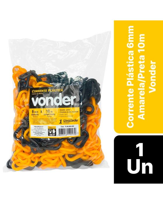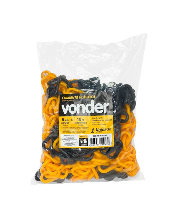 Características:A corrente plástica Vonder é a solução ideal para demarcações e sinalizações! Com espessura de 6mm e 10 metros de comprimento, ela oferece resistência e durabilidade, sendo perfeita para uso interno e externo. Sua cor amarela e preta proporciona alta visibilidade garantindo segurança em áreas de trabalho, eventos e obras, sendo um produto leve e fácil de manusear, além de ser um produto versátil e possui diversas aplicações.Detalhes:- Marca: Vonder;- Modelo: 15.46.060.000;- Linha: Correntes de sinalização;- Cor: Preto e Amarelo;- Espessura: 6mm;- Tamanho: 10cm;- Contém: 1 unidade do produto com 10 metros de comprimento;- Acompanha: Elo nas duas pontas;- Para ambientes externos e internos;- Não reflexivo;- Resistente.Fabricado na China | Validade: Indeterminada.Ideal para:- Indicado para isolamento/ delimitação para sinalização de trânsito, estacionamentos, obras, práticas esportivas, auto escolas, shoppings entre outros.Riscos:- Riscos que apresentem à saúde e à segurança: Tropeço.Composição:- Fabricado em polietileno de alta durabilidade.Medidas:- Dimensões da embalagem: 27,5 x 20 x 4,5cm (CxLxA);- Peso: 0,750g.Conteúdo da embalagem: 1 Corrente Plástica 6mm Amarela/Preta 10m Vonder.Garantia do fornecedor: 90 dias contra defeitos de fabricação.ATENÇÃO! EMBALAGENS PLASTICAS PODEM SER PERIGOSAS. PARE EVITAR RISCOS DE SUFOCAMENTO, MENTENHA A EMBALAGEM DO PRODUTO FORA DO ALCANCE DE CRIANÇAS.* As especificações podem ser alteradas sem aviso prévio ** Imagem meramente ilustrativa.