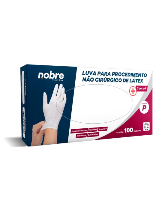 Caracteristicas:A luva proporciona proteção no contato com sangue, fluidos orgânicos, membranas mucosas, artigos sujos ou em outros procedimentos não invasivos.Detalhes: - Marca: Nobre.- Modelo: 52654.- Linha: Luva de Latéx.- Cor: Branca.- Tamanho: P.- Contém: 1 caixa com 100 unidades.- Para: procedimento não cirúrgico.- Com pó.- Ambidestras e superfícies lisas.- Não estéril.- Produto de uso único.Validade 5 anos.Modo de uso: - Realizar a assepia prévia das mãos.- Calçar as luvas cuidadosamente com as mãos secas, sem adornos que possam perfurá-las.- Executar o procedimento.- Após o uso, retirar as luvas descartando-as imediatamente em local adequado.- Não reutilizar ou esterilizar as luvas após seu uso.Medidas:- Dimensões: 6 x 23 x 11cm (CxAxL).- Peso: 510g.Composição: - Produto confeccionado em latéx de borracha natural.Atenção: Proibido reprocessar, destruir após o uso!ALÉRGICOS: ESTE PRODUTO CONTÉM LATÉX DE BORRACHA NATURAL, SEU USO PODE CAUSAR REAÇÕES ALÉRGICAS EM PESSOAS SENSÍVEIS AO LATÉX.Em caso de reações alérgicas, procure um médico.* As especificações podem ser alteradas sem aviso prévio ** Imagem meramente ilustrativa