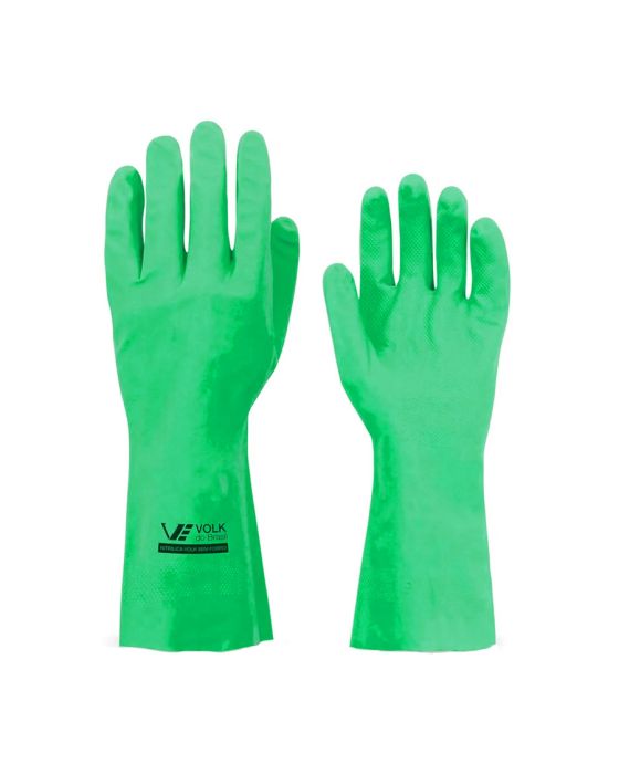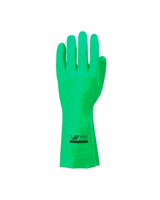 Características:Luva de segurança confeccionada em nitrila, relevo antiderrapante na face palmar e ponta dos dedos. Detalhes:- Marca: Volk;- Modelo: Nitrílica sem forro;- Referência: 10.65.010.03;- Linha: Luvas de proteção individual;- Cor: Verde;- Tamanho: G (9);- CA: 16.314 (validade 10/12/2025;- Contém: 1 par de luvas;- Comprimento: 30cm;- Uso: Reutilizável;- Formato: Anatômico;- Sem forro;- Acabamento interno: Clorinado;- Punho: Reto;- Grip: Diamante;- Antiderrapante;- Excelente Opção para atender a RDC 26;- Proteção Química e elasticidade moderada.Fabricado no Sri Lanka. | Validade: 5 anos a partir da data de fabricação.Ideal para:- Indicado para trabalhos gerais, leves e médios, protegendo o trabalhador contra agentes químicos, podendo ser utilizada nos setores operacionais de indústrias automotivas, alimentícias frigorífica (aves, pescas e bovíno, higiene e limpeza, saneamento, metalmecânica, naval, construção cívil, uso domésticos e outras.Vantagens e Benefícios100% Nitrílica: Livre de proteínas do látex;Antiderrapante: Em formato diamante, permite o bom fluxo de líquidos evitando que os mesmos acumulem na superfície da luva para uma ótima aderência;Formato Anatômico: Redução da fadiga muscular;Punho Reto: Permite maior ventilação, além disso, evita que materiais fiquem impregnados no punho da luva;Redução de Custos: Luvas laváveis e reutilizáveis. Aumenta consideravelmente o ciclo de vida da luva e reduz os custos da empresa.Geral:- Resistência Mecânica: EN388 – Desempenho 3101X- Resistência Química: EN374 – Desempenho A1C1J5K6N2O5P6T6- ISO 374-5 – Aprovado para proteção contra fungos e bactérias.- Produtos Químicos Adicionais: Hipoclorito de sódio 13%: 6 / Cloreto de Benzalcanio 50%: 6 / Ácido Peracético 0,2%: 6.Orientações:- Quando necessário, lave o EPI utilizando sabão/detergente neutro;- Lave e enxágue em água, preferencialmente, em temperatura ambiente;- Não utilize alvejantes, água sanitária ou realize processo de lavagem a seco;Composição:- Fabricada em Nitrila. Medidas:- Dimensões do produto: 38,5 x 14,8 x 0,05cm (CxLxA);- Peso: 72g.* As especificações podem ser alteradas sem aviso prévio ** Imagem meramente ilustrativa.