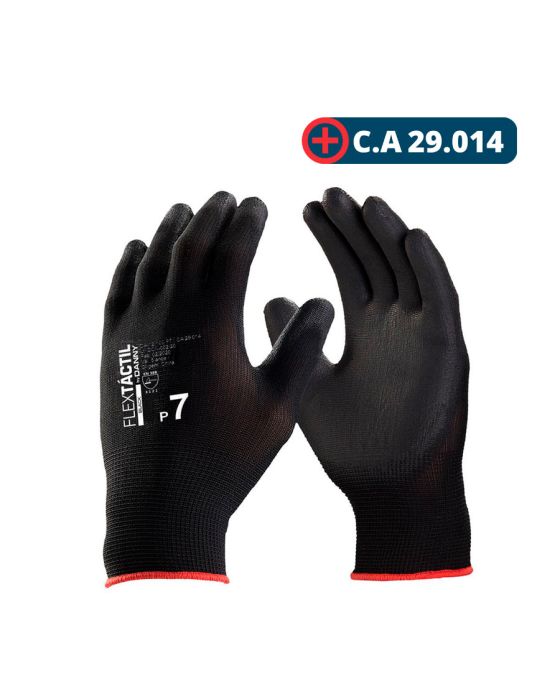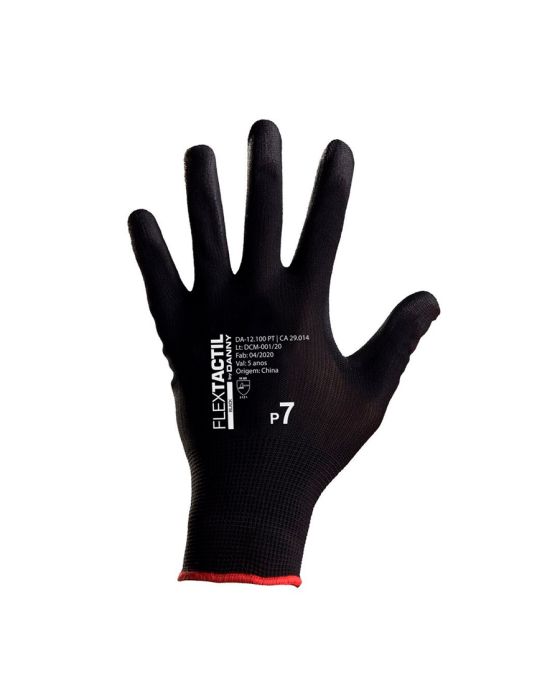 Características:- Proteção sem perda de tato em atividades profissionais: A Luva Tricotada Flextáctil Preta Danny é confeccionada em nylon com recobrimento em poliuretano na palma, face palmar e ponta dos dedos, proporcionando excelente destreza, precisão nos movimentos e manuseio seguro de peças secas ou úmidas. Seu formato anatômico e punho elástico garantem ajuste perfeito às mãos, reduzindo a fadiga muscular mesmo em longos períodos de trabalho.- Alta resistência e desempenho técnico: Desenvolvida para suportar as exigências de diferentes setores, a luva oferece excelente performance abrasiva conforme norma EN 388 (3131A), além de resistência térmica de até 100°C em calor de contato. A cor preta aumenta sua durabilidade, disfarçando sujidades e prolongando sua vida útil em comparação às luvas tradicionais de malha.- Proteção antiestática e conforto superior: Com propriedade antiestática dissipativa, a luva protege equipamentos eletroeletrônicos contra descargas durante o manuseio. Seu dorso ventilado contribui para maior conforto térmico, enquanto a estrutura em nylon evita o desprendimento de fiapos, preservando a qualidade das peças manipuladas.- Versatilidade de uso: Indicada para indústrias metalmecânica, automobilística, moveleira, construção civil, montagem e manutenção em geral, sendo uma solução de excelente custo-benefício para quem busca proteção, precisão e conforto em um único equipamento de proteção individual.- Sobre a marca Danny: A Danny é referência nacional em Equipamentos de Proteção Individual (EPIs), reconhecida por sua inovação, qualidade e foco na segurança do trabalhador. Seus produtos seguem rigorosos padrões técnicos e são projetados para entregar confiabilidade, conforto e durabilidade no uso profissional.- Especificações técnicas:Cor: Preto com elástico vermelho.Tamanho: P/7.Certificação: CA 29.014.Contém: 1 par.- Dimensões do produto:Comprimento: 24,5cm;Largura: 12cm;Altura: 0,1cm;Peso: 3g.* As especificações podem ser alteradas sem aviso prévio ** Imagem meramente ilustrativa.