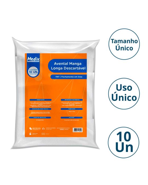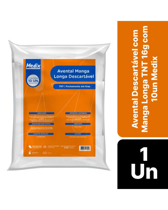 Características:O Avental Descartável Manga Longa 16g Medix promove higiene e proteção contra possíveis contaminações durante procedimentos em geral, ideal para uso nas áreas de saúde, estética, gastronômicas e industriais. É produzido inteiramente em tecido não tecico (TNT) 100% polipropileno do tipo agulhado com processo de costura em overloque, possui manga longa e punho com elástico e seu fechamento em tiras, o que facilita na hora de retirar e descartar o produto.Detalhes:- Marca: Medix;- Referência: 5783;- Linha: Aventais;- Tipo: Descartável;- Cor: Branco;- Tamanho: Único (1,30±5cm largura e 100±5cm comprimento aproximadamente);- Gramatura: 16g/m2;- Quantidade por embalagem: 10 unidades;- Contém: 1 embalagem com 10 unidades do produto;- Fechamento em tiras;- Apirogênico e Hipoalergênico;- Fechado com costuras overloque em todo o perímetro; - Com mangas longas que possuem terminação nos punhos com elástico;- Não estéril e atóxico;- Uso único.Fabricado na China. | Validade: 5 anos após a data de fabricação.Ideal para:- Indicado para Hospitais, Clínicas de saúde e estética, Laboratórios, Restaurantes e Lanchonetes e em áreas industriais.Modo de uso:- Verifique a integridade da embalagem;- Coloque o produto sobre o corpo, ajustando na região do dorso;- Amarre as tiras do pescoço e da cintura de maneira firme e confortável;- Após o uso, retire o avental e descarte-a imediatamente em local adequado.Conservação:- Mantenha em local seco.Orientações:- Não reutilizar ou esterilizar após o uso;- Proibido reprocessar.Composição:- Produto confeccionado em 100% polipropileno tecido não tecido (TNT) do tipo agulhado.Medidas: - Dimensões da embalagem: 27 x 24,5 x 3,5cm (CxLxA);- Peso: 360g.ATENÇÃO: PROIBIDO REPROCESSAR, DESTRUIR APÓS O USO!Registro Anvisa: 80495510128.* As especificações podem ser alteradas sem aviso prévio ** Imagem meramente ilustrativa.
