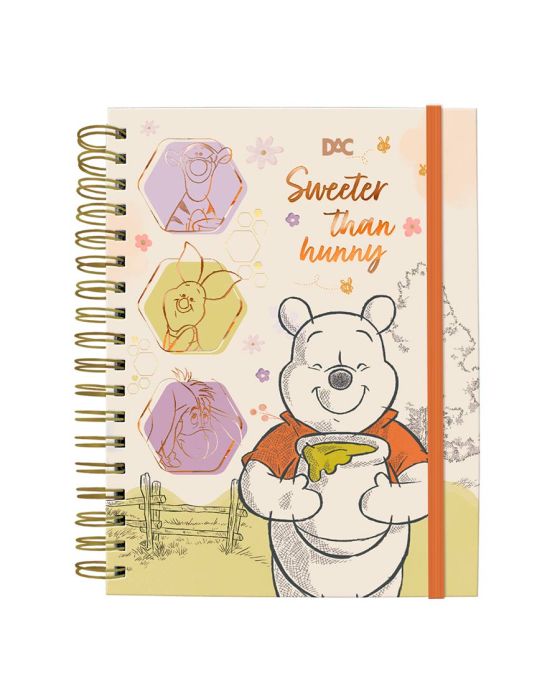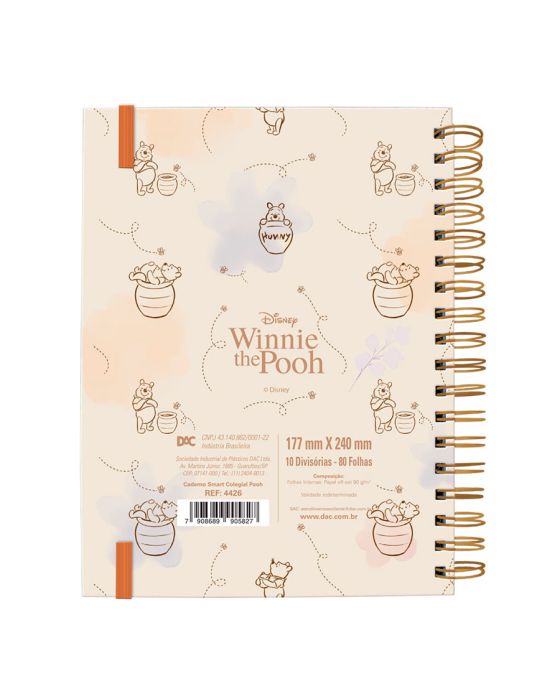 Características:O caderno DAC Smart é lindo, sofisticado e muito resistente, pois é de metal grosso e totalmente fixo com a capa, sem ficar balançando ou com o risco de cair e desmontar.Smart porque é versátil, é possível remover, acrescentar e reordenar as folhas sem qualquer dano a elas ou à estrutura do caderno. Tipo um fichário, mas muito mais fácil.Detalhes:- Marca: DAC;- Modelo: Disney Pooh;- Referência: 4426;- Linha: Cadernos Smart;- Capa: Capa dura com laminação brilho e hotstamping;- Contra capa: Contra capa simples;- Formato: 177 x 240mm (17,7 x 24cm);- Tamanho: Colegial;- Quantidade de páginas: 80 páginas;- Contém: 1 unidade do produto com 80 páginas;- Espiral: Dourado;- Fechamento: Em elástico;- 10 divisórias em papel, todas removíveis com a possibilidade de remanejar para onde quiser.Composição:- Papel Offset com gramatura de 90g/m2.Medida:- 17,7 x 24cm (CxL).* As especificações podem ser alteradas sem aviso prévio ** Imagem meramente ilustrativa.