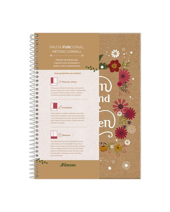 Características:O Caderno Universitário Capa Dura Kraft Art é o mais novo lançamento da categoria Para o Ano Todo. Trata-se de uma coleção desenvolvida e elaborada em papel kraft com estampas florais e divertidas.Possui pauta funcional com o método Cornell, este método organiza suas anotações e ajuda a reter conhecimento!Detalhes:- Marca: Foroni;- Modelo: Kraft Art Funcional;- Referência: 6126;- Linha: Caderno;- Tipo: Espiral;- Capa: Capa dura com papel kraft;- Contra capa: Contra capa simples na cor cinza;- Quantidade de folhas: 80 folhas;- Quantidade de matérias: 1 matéria;- Contém: 1 unidade do produto com 80 folhas;- Formato: 200 x 275mm (20 x 27,5cm);- Gramatura: 63g/m2;- Cor espiral: Branca;- Folhas funcional: Pauta Método Cornell na Preta;- Cor das folhas: Branca;- Idiomas: Português e Espanhol;- Possui bolsa dupla de papel decorada para documentos;- Miolo;- Produto certificado: FSC.Indústria Brasileira.Como preencher o seu material:- Palavras chaves: Feito para o momento da revisão, aqui você ira destacar aquilo que te faça lembrar rapidamente do assunto. Escreva frases curtas ou tópicos, extraindo as principais ideias do conteúdo;- Anotações: Neste espaço, são feita anotações, desenhos, esquemas ou qualquer outra coisa que te ajude na compreensão do assunto. Aqui você também pode registrar suas dúvidas e insights que teve durante os estudos.- Resumo: Use esta área para fazer um pequeno resumo sobre tudo o que foi abordado no assunto. A ideia é você condensar as informações para que consiga lembrá-las com mais facilidade. Exercício importante para fixar o que foi aprendido, analisado como você reteve a nova informação.Composição:- Capa: Fabricado em papelão e papel Kraft;- Folhas Internas: Papel Offset 63g/m2.Medidas:- Dimensões do produto: 200 x 275mm (20 x 27,5cm);- Gramatura: 63g/m2.* As especificações podem ser alteradas sem aviso prévio ** Imagem meramente ilustrativa.