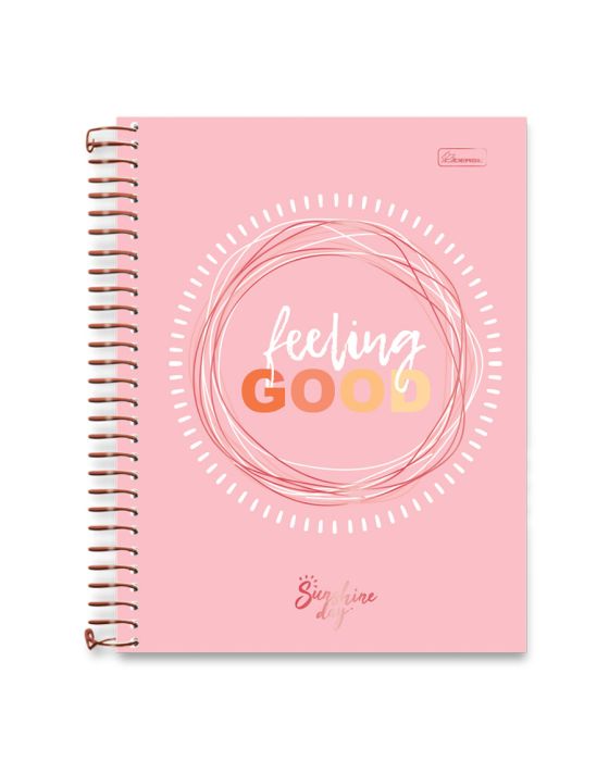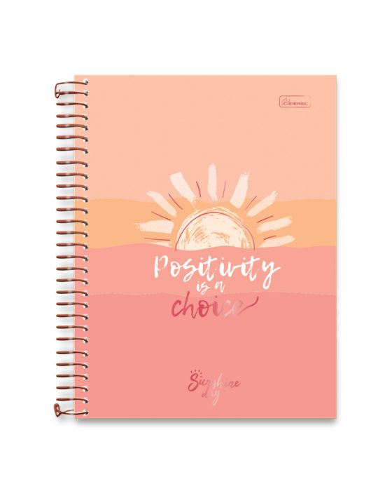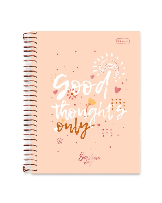Bons pensamentos para dias ensolarados, essa é a vibe! A linha Sunshine Day é puro brilho e positividade, ela trouxe frases inspiradoras destacadas em hot stamping rose gold. Um charme! O Caderno Universitário possui bolsa portfólio, cartela de adesivos, editorial, divisórias de matérias, miolo com microsserrilhas e espiral rose gold.