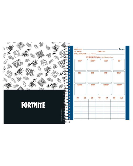 Caracteristicas:O Caderno Espiral Universitário Fortnite possui capa dura com a parte interna decorada, bolsa de papel decorada para guardar trabalhos e anotações, folhas pautadas e espiral preto.Ideal para o dia a dia na escola ou na faculdade.- Capa dura- 10 matérias com 200fls- Laminação Fosca- Bolsa de papel- Pauta e divisória decoradas- Espiral Preto- Verniz Reserva- Formato: 200 x 275 mm* As especificações podem ser alteradas sem aviso prévio ** Imagem meramente ilustrativa.