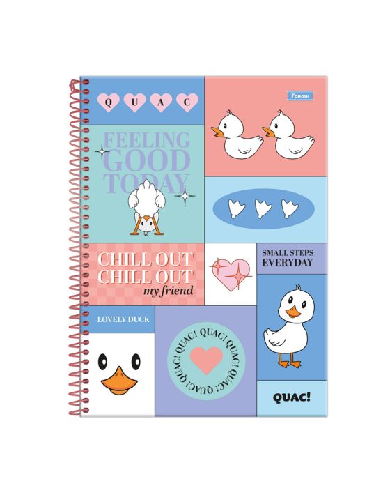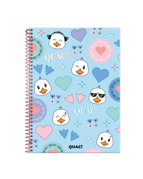Características:O Caderno Universitário Capa Dura Quac! possui em suas capas a presença de patinhos - um animal que vêm ganhando cada vez mais destaque nas redes sociais. O desenho caricato e as cores chamativas da linha deixem a rotina mais alegre e divertida.Detalhes:- Marca: Foroni;- Modelo: Quac!;- Referência: 3164615;- Linha: Cadernos Espiral;- Tipo: Universitário;- Capa: Capa Dura com laminação fosca e Super Hot Stamping (Estampas sortidas);- Contra capa: Contra capa decorada;- Quantidade de folhas: 80 folhas;- Quantidade de matérias: 1 matéria;- Contém: 1 unidade do produto com 80 folhas;- Formato: 200 x 275mm (20 x 27,5cm);- Gramatura: 56g/m2;- Espiral: Rose Gold;- Folhas: pautadas cinza decorada;- Possui bolsa plástica transparente;- Possui uma cartela de adesivos especiais;- Índice/separador de matérias decorado;- Miolo;- Produto certificado: FSC.Composição:- Capa: Fabricado em papelão e papel couché;- Folhas Internas: Papel Offset 56g/m2.Medidas:- Dimensões do produto: 200 x 275mm (20 x 27,5cm);- Gramatura: 56g/m2.Estampas sortidas, será enviado de acordo com a disponibilidade do estoque. Não é possível escolher uma estampa específica.* As especificações podem ser alteradas sem aviso prévio ** Imagem meramente ilustrativa.