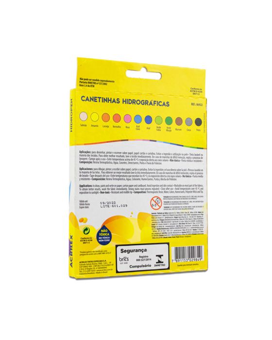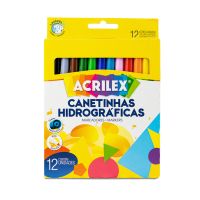 Caracteristicas:Faça desenhos e pinturas incríveis nos mais diversos tipos de papeis para os seus projetos, são 12 cores para trazer alegria a cada traço!Detalhes:- Marca: Acrilex.- Modelo: 06902.- Linha: Canetinhas Hidrográficas.- Cores: 12 cores variadas.- Contém: 1 estojo com 12 cores.- Ponta: 2mm.- Não Acalca.- Tampa ventilada.- Não tóxica.- Ponta fina e resistente.- Lavável.- Tampe após o uso.Cores:- Amarelo Ouro, Laranja, Vermelho, Cenoura, Rosa, Lilás, Turquesa, Azul Celeste, Azul Turquesa, Verde Musgo, Marrom e Preto.Onde usar:- Papéis cartão, cartolina e papel comum.Composição:- Resina termoplástica, Água, Corantes, Umectantes, Ponta e pavio de poliéster.Em caso de manchas:- Lave o tecido imediatamente.- Em caso de manchas de difícil remoção, repita o processo de lavagem.Recomendações:- Evite temperaturas acima de 45ºC e exposição direta aos raios solares.ATENÇÃO! Não recomendável para crianças de até 3 (três) anos por conter partes pequenas que podem ser engolidas ou aspiradas.* As especificações podem ser alteradas sem aviso prévio ** Imagem meramente ilustrativa.