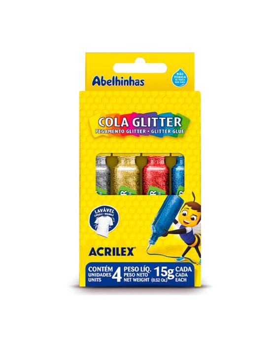Caracteristicas:Ideal para você quem decorar, colocar brilho ou usar a imaginação ao criar artes únicas e cheio de brilho, a Cola Glitter Acrilex vem com quatro cores para você arrasar! Detalhes:- Marca: Acrilex.- Modelo: - Linha: Cola com Glitter.- Cores: Prata, Dourado, Vermelho e Azul.- Contém: 1 embalagem com 4 unidades do produto.- Não tóxica.- Possui brilho intenso.- Solúvel em água.Como usar: - Possui um exclusivo bico aplicador que facilita a pintura, podendo ser usada também com esponja ou pincel, para fazer colagens, relevos coloridos, decorar e pintar.Ideal para:- Para fazer colagens, decorar e pinturas.Aplicação: - Pode ser aplicado em: papel, papel cartão e cartolina.Conservação:- Conserve em local fresco e seco.- Tampe após o uso.Composição:- Resina de P.V.A., Glitter e Conservante.* As especificações podem ser alteradas sem aviso prévio ** Imagem meramente ilustrativa.