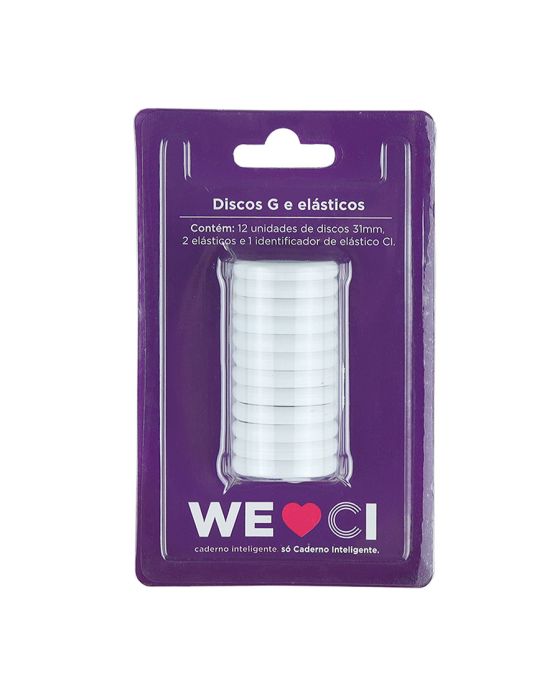 Características:Mude as cores dos discos e do elástico do seu Caderno Inteligente®, deixando-o sempre com cara de novo! ;)Detalhes:- Marca: Caderno Inteligente;- Referência: CI312001;- Linha: Discos G;- Cor: Branco;- Contém: 1 embalagem com 12 unidade do produto, 1 elástico e 1 Pin;- Compatível com todos os produtos e acessórios Caderno inteligente;- Tamanho dos discos: 31mm (3,1cm);- Fácil de colocar e retirar;- Produto atóxico;- Produto original.Indústria brasileira. | Validade: Indeterminada.Modo de troca dos discos:- Retire os discos que acompanham o Caderno Inteligente;- Coloque os novos discos da sua preferência no seu Caderno Inteligente;- Encaixe as folhas novamente;- Está pronto para arrasar.Acompanha:- 12 discos na cor branca;- 2 elásticos na cor branca;- 1 identificador de elástico CI na cor branca.Composição:- Fabricado em ABS, poliéster, elastano e Látex.Medidas:- Dimensões do da embalagem: 14,5 x 9,1 x 3,5cm (CxLxA);- Peso: 149g.* Por se tratar de um produto artesanal, a tonalidade pode variar.ATENÇÃO! NÃO RECOMENDÁVEL PARA CRIANÇAS DE ATÉ 3 (TRÊS) ANOS POR CONTER PARTE(S) PEQUENA(S) QUE PODEM SER ENGOLIDA(S) OU ASPIRADA(S). * As especificações podem ser alteradas sem aviso prévio ** Imagem meramente ilustrativa.