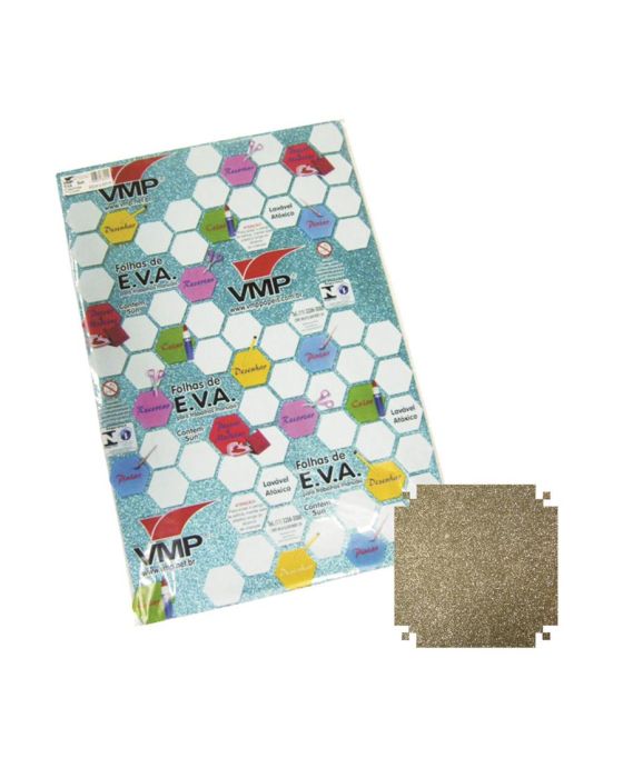 Caracteristicas:O EVA é um material muito usado no meio artesanal em virtude de suas características apropriadas para criação. Basicamente é um emborrachado que permite dobraduras, colagens e pinturas, e se mostra um material bem simples de usar. EVA, em português, é a sigla de 'Espuma Vinílica Acetinada', sigla escolhida para coincidir com a do nome técnico de sua matéria-prima, 'Ethylene Vinyl Acetate'. É um material termoplástico, uma espuma sintética de custo acessível muito usada para produtos infantis e material escolar.- Folha E.V.A com glitter - Tamanho: 40 x 60 cm - Espessura: 2 mm - Marca: VMP- Quantidade: 5 folhas/pacoteE.V.A é um material bastante flexível, apropriado para diversas finalidades, permite a utilização de trabalhos com colagem, costura, pintura, corte, modelagem e onde sua imaginação mandar. * As especificações podem ser alteradas sem aviso prévio ** Imagem meramente ilustrativa