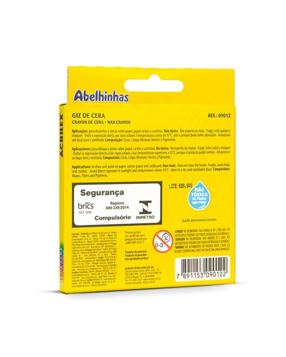Caracteristicas:Foi desenvolvido para trabalhos infantis, ajudando a criança no aprendizado da escrita e no desenvolvimento da sua coordenação motora e de sua criatividade através da pinturaDetalhes:- Marca: Acrilex.- Modelo: 09012.- Linha: Giz de cera.- Cores: 12 cores.- Contém: 1 unidade do produto com 12 cores mistas.- Não tóxico.- Fabricado com ceras de alta qualidade, proporcionando traço macio e cobertura de grandes áreas sem esforço- Não mancha as mãos.- Giz Fino.Ideal para:- É ideal para o uso na Pré-Escola e em trabalhos escolares diversos. - Ideal para desenhar, escrever e pintar sobre papel, cartolina, papel cartão e também para trabalhos com acabamento artístico.Aplicação:- Para desenhar e pintra sobre papel, papel cartão e cartolina.Composição:- Ceras, Cargas, Minerais Inertes e Pigmentos.Conservação:- Frágil, evite quedas e choques.- Evite a exposição direta aos raios solares e temperaturas acima de 45ºC, pois o produto pode sofrer alterações.- Armazenar em local seco e ventilado.Medidas:Dimensões: 9,5 cm altura.ATENÇÃO! PRODUTO NÃO RECOMENDAVÉL PARA CRIANÇAS DE ATÉ 3(TRÊS) ANOS, POR CONTER PARTE(S) PEQUENA(S) QUE PODE(M) SER ENGOLIDA(S) OU ASPIRADA(S).* As especificações podem ser alteradas sem aviso prévio ** Imagem meramente ilustrativa.