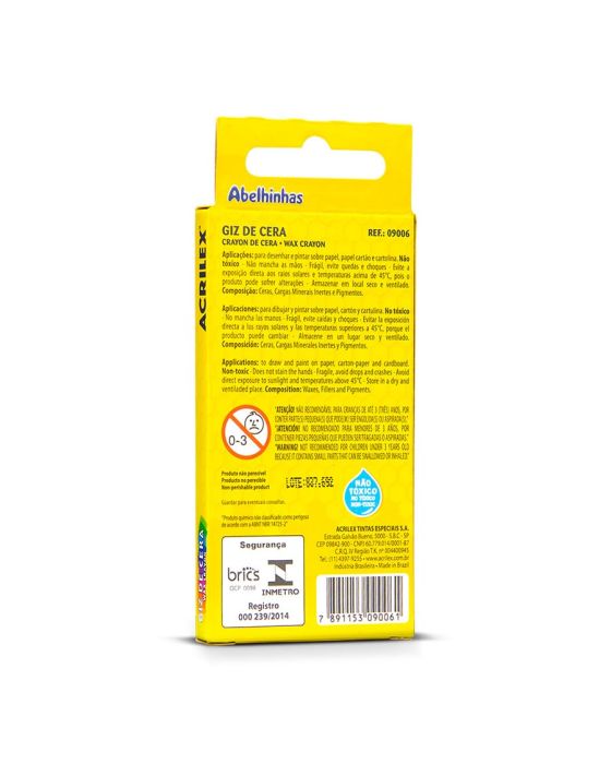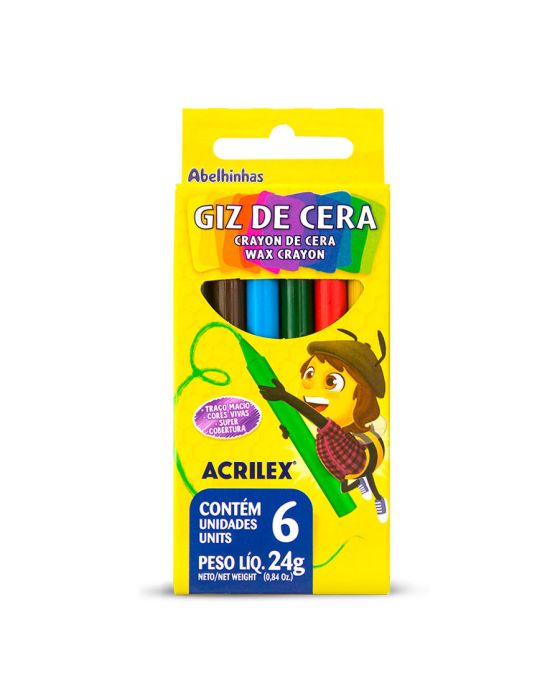 Caracteristicas:Foi desenvolvido para trabalhos infantis, ajudando a criança no aprendizado da escrita e no desenvolvimento da sua coordenação motora e de sua criatividade através da pinturaDetalhes:- Marca: Acrilex.- Modelo: 09006.- Linha: Giz de cera.- Cores: 6 cores.- Contém: 1 unidade do produto com 6 cores mistas.- Não tóxico.- fabricado com ceras de alta qualidade, proporcionando traço macio e cobertura de grandes áreas sem esforço.- Não mancha as mãos.- Giz Fino. Ideal para:- É ideal para o uso na Pré-Escola e em trabalhos escolares diversos.- Ideal para desenhar, escrever e pintar sobre papel, cartolina, papel cartão e também para trabalhos com acabamento artístico.Aplicação:- Para desenhar e pintra sobre papel, papel cartão e cartolina.Composição:- Ceras, Cargas, Minerais Inertes e Pigmentos.Conservação: - Frágil, evite quedas e choques.- Evite a exposição direta aos raios solares e temperaturas acima de 45ºC, pois o produto pode sofrer alterações.- Armazenar em local seco e ventilado.Medidas: Dimensões: 9 cm altura x 8mm diâmetro.ATENÇÃO! PRODUTO NÃO RECOMENDAVÉL PARA CRIANÇAS DE ATÉ 3(TRÊS) ANOS, POR CONTER PARTE(S) PEQUENA(S) QUE PODE(M) SER ENGOLIDA(S) OU ASPIRADA(S).* As especificações podem ser alteradas sem aviso prévio ** Imagem meramente ilustrativa.