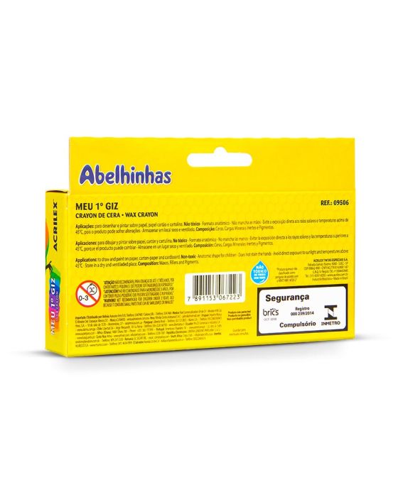 Caracteristicas:Meu primeiro giz foi desenvolvido especialmente pela Acrilex para auxiliar a coordenação motora das crianças, ideal para o primeiro contato com os giz de cera!Detalhes:- Marca: Acrilex.- Modelo: Meu Primeiro Giz.- Referência: 09506.- Linha: Giz de cera.- Cores: Branco, Amarelo, Salmão, Laranja, Vermelho, Vermelho Carmim, Azul Claro, Azul Escuro, Verde Claro, Verde Escuro, Marrom e Preto.- Contém: 1 embalagem do produto com 6 cores mistas.- Volume/Peso: 370g.- Para trabalhos infantis.- Formato anatômico que facilita a pega.- Ajuda no desenvolvimento da motricidade.- Não tóxico.- Não mancha as mãos.Ideal para: - Para desenhar e pintar sobre papel, papel cartão e cartolinaConservação: - Evite a exposição direta aos raios solares e temperatura acima de 45°C, pois o produto pode sofrer alterações.- Armazenar em local fresco e ventilado.Composição:- Ceras, Cargas minerais inertes e pigmentos.ATENÇÃO! NÃO RECOMENDADO PARA CRIANÇAS DE ATÉ 3(TRÊS) ANOS, POR CONTER PARTE(S) PEQUENA(S) QUE PODE(M) SER ENGOLIDA(S)OU ASPIRADA(S). * As especificações podem ser alteradas sem aviso prévio ** Imagem meramente ilustrativa.
