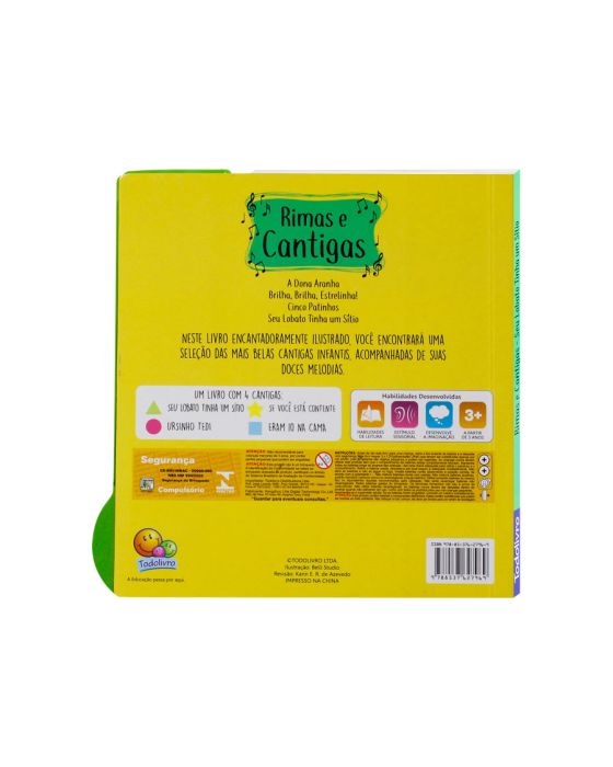 Caracteristicas:Neste livro você encontrará uma seleção com as mais belas cantigas infantis.Com lindas ilustrações, textos fáceis de entender, o livro é acompanhado do som destas divertidas cantigas! Um livro com 4 cantigas: - Seu Lobato tinha um sítio - Ursinho Tedi - Se você está contente - Eram 10 na camaHabilidades desenvolvidasHABILIDADES DE LEITURA ESTÍMULO SENSORIAL DESENVOLVE A IMAGINAÇÃO Descrição do Livro-Formato: 18x19 cm -Páginas: 8 -Faixa Etária: De 3 a 5 anos -Acabamento: Livro cartonado com som * As especificações podem ser alteradas sem aviso prévio ** Imagem meramente ilustrativa