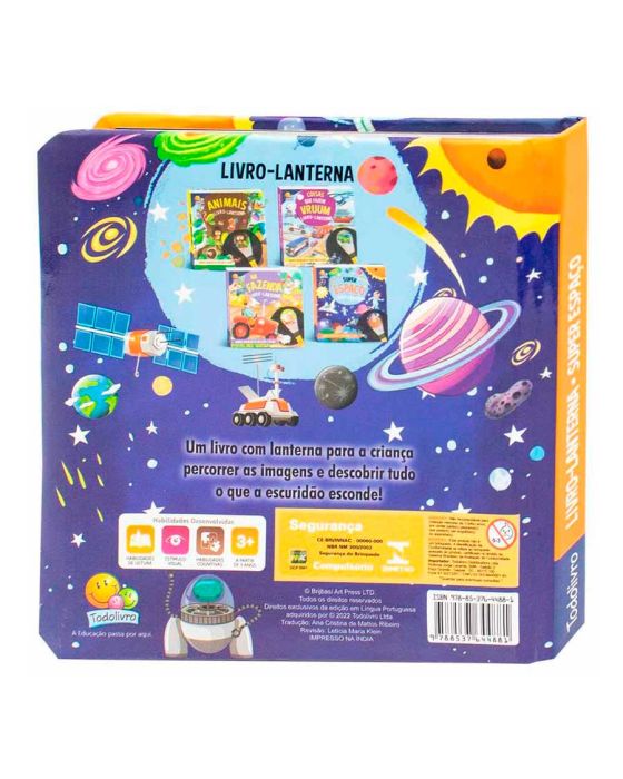 Características:Um livro com Lanterna para a criança percorrer as imagens e descobrir tudo o que a escuridão esconde!Detalhes:- Marca: Todolivro;- Coleção: Livro Lanterna;- Modelo: SuperEspaço;- Referência: 1163116;- Linha: Livros Infantis;- Capa: Capa dura almofadada com laminação fosca e reserva de verniz;- Contra capa: Decorada;- Quantidade de páginas: 12 páginas;- Formato: 16,7 x 16,7 cm;- Contém: 1 unidade do produto;- Faixa etária: A partir de 3 anos;- Idioma: Português;- Acompanha: Lanterna mágica.Medidas:- Dimensões do produto: 16,7 x 16,7cm.Conteúdo da embalagem: 1 Livro Lanterna: SuperEspaço.* As especificações podem ser alteradas sem aviso prévio ** Imagem meramente ilustrativa