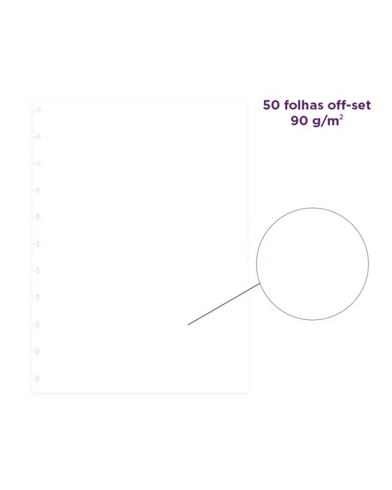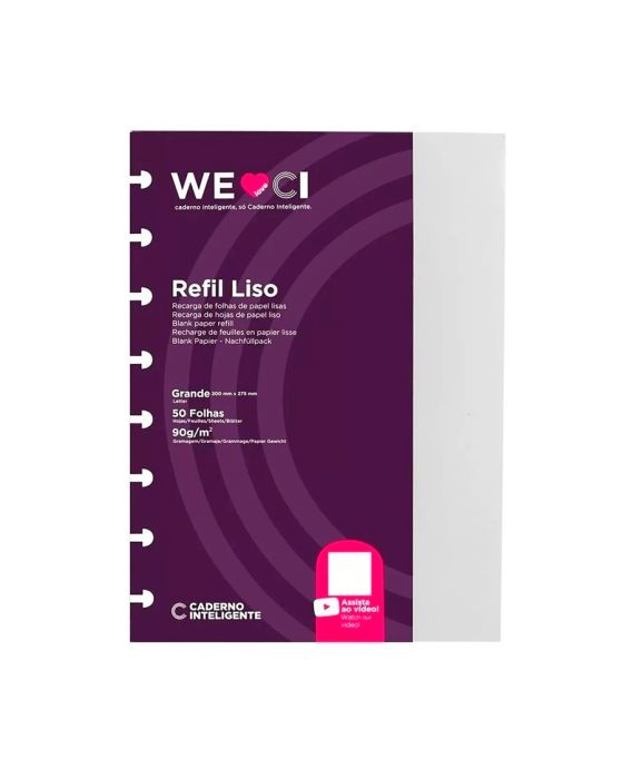Características:Calma! Você sempre pode contar com o Caderno Inteligente!Para fazer suas anotações livremente, e até mesmo ilustrações, conheça o refil liso de folhas para CI. Com folhas brancas e lisas, você pode criar resumos, mapas mentais, pode colorir ou escrever sem regras, além de imprimir textos e figuras e inserir nas páginas. É mais autonomia para personalizar seu Caderno Inteligente e registrar o que quiser. Seu #cadernobff ainda mais com a sua cara!Detalhes:- Marca: Caderno Inteligente;- Referência: CIRG4001;- Linha: Refis;- Tipo: Sem pauta;- Formato: Grande;- Cor: Branco;- Quantidade folhas: 50 folhas;- Contém: 1 unidade do produto;- Tamanho: 200mm X 275mm (20 x 27,5cm);- Gramatura: 90g/m2;- Folhas: Lisa, sem pauta;- Fácil de colocar no caderno inteligente;- Papel resistente e de longa durabilidade;- Produto atóxico;- Produto original.Indústria Brasileira. | Validade: Indeterminada.Instruções de manuseio:- Segure a folha com os dedos próximos aos discos e puxe-a suavemente de cima para baixo;- Nunca puxe as folhas pela lateral, isso pode danificá-las e prejudicar o encaixe posterior;- Para recolocar uma folha, posicione-a sobre os discos e encaixe-a pressionando com os dedos;- Cada tamanho de disco comporta uma quantidade máxima de itens. Respeite esse limite para não ter problemas com folhas “se soltando”.Composição:- Fabricado em Celulose.Medidas:- Dimensões do produto: 27,5 x 20 x 0,6cm (CxLxA);- Peso: 160g.* Por se tratar de um produto artesanal, a tonalidade pode variar.ATENÇÃO! NÃO RECOMENDÁVEL PARA CRIANÇAS DE ATÉ 3 (TRÊS) ANOS POR CONTER PARTE(S) PEQUENA(S) QUE PODEM SER ENGOLIDA(S) OU ASPIRADA(S). * As especificações podem ser alteradas sem aviso prévio ** Imagem meramente ilustrativa.