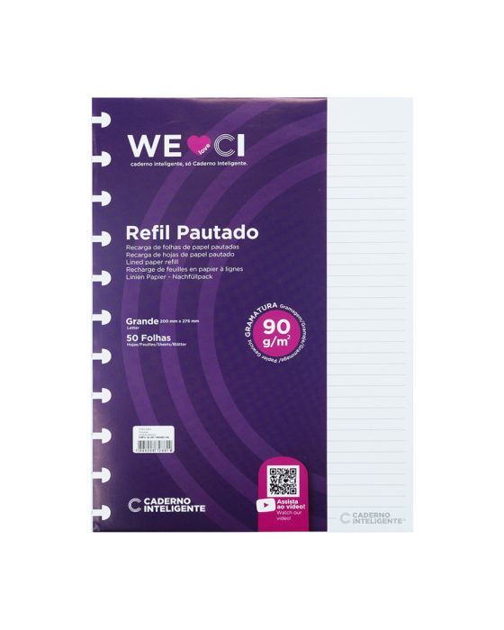 Características:Calma! Você sempre pode contar com o Caderno Inteligente!O refil pautado é composto por 50 folhas de papel pautado. E não precisa se preocupar com espaço, já que com o prático e inovador sistema de reposicionar folhas do caderno de discos, o seu Caderno Inteligente fica sempre do jeito que você quiser. Adicione mais refis para manter o seu queridinho como novo!Detalhes:- Marca: Caderno Inteligente;- Referência: CIRG4003;- Linha: Refis;- Tipo: Pautado;- Formato: Grande;- Cor: Branco;- Quantidade folhas: 50 folhas;- Contém: 1 unidade do produto;- Tamanho: 200mm X 275mm (20 x 27,5cm);- Gramatura: 90g/m2;- Folhas: Pautada na cor cinza;- Fácil de colocar no caderno inteligente;- Papel resistente e de longa durabilidade;- Produto atóxico;- Produto original.Indústria Brasileira. | Validade: Indeterminada.Instruções de manuseio:- Segure a folha com os dedos próximos aos discos e puxe-a suavemente de cima para baixo;- Nunca puxe as folhas pela lateral, isso pode danificá-las e prejudicar o encaixe posterior;- Para recolocar uma folha, posicione-a sobre os discos e encaixe-a pressionando com os dedos;- Cada tamanho de disco comporta uma quantidade máxima de itens. Respeite esse limite para não ter problemas com folhas “se soltando”.Composição:- Fabricado em Celulose.Medidas:- Dimensões do produto: 27,5 x 20 x 0,6cm (CxLxA);- Peso: 160g.* Por se tratar de um produto artesanal, a tonalidade pode variar.ATENÇÃO! NÃO RECOMENDÁVEL PARA CRIANÇAS DE ATÉ 3 (TRÊS) ANOS POR CONTER PARTE(S) PEQUENA(S) QUE PODEM SER ENGOLIDA(S) OU ASPIRADA(S). * As especificações podem ser alteradas sem aviso prévio ** Imagem meramente ilustrativa.