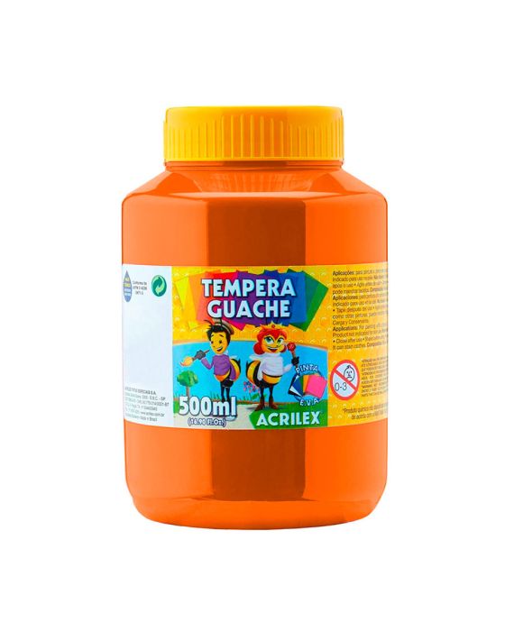 Características:A Têmpera Guache Acrilex é um importante instrumento para o desenvolvimento da criatividade, coordenação motora e percepção visual das cores.Detalhes:- Marca: Acrilex.- Referência: 517.- Linha: Tinta Guache.- Cor: Laranja.- Contém: 1 unidade do produto.- Volume: 500ml.- Não tóxica.- Agite bem antes de usar.- Solúvel em água.Aplicação:- Pode ser aplicada em papel, papel cartão, cartolina, gesso, madeira, cerâmica e E.V.A.Composição:- Resina, Água, Pigmentos, Carga e Conservante.* As especificações podem ser alteradas sem aviso prévio ** Imagem meramente ilustrativa.