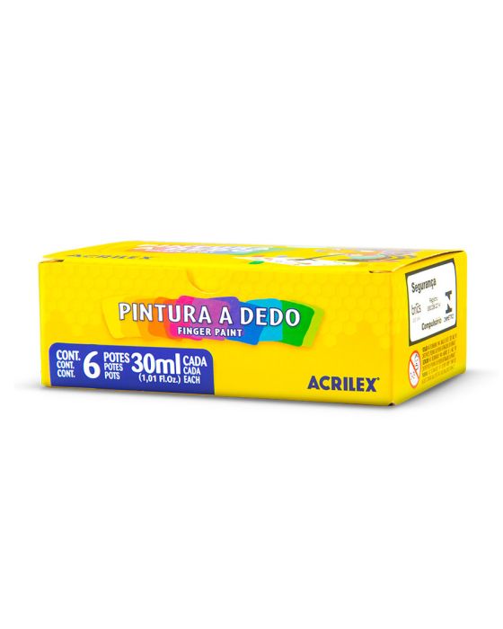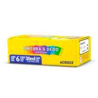 Caracteristicas:É o primeiro contato das crianças com a tinta. A Pintura a Dedo permite desenvolver atividades com as mãos, o que aumenta o desenvolvimento da percepção tátil e da coordenação motora.Detalhes:- Marca: Acrilex.- Modelo: Pintura a dedo.- Referência: 11306.- Linha: Tintas.- Cores: Branco, Amarelo Ouro, Vermelho, Azul, Verde e Preto.- Contém: 1 embalagem com 6 cores.- Volume: 30ml cada pote.- Não tóxica.- Solúvel em água.- Cores miscíveis entre si.Tinta ideal para:- Tinta ideal para atividades com as mãos.- Para efeito decorativo em trabalhos escolares.Aplicação:- Pode ser aplicada sobre papel, papel cartão, cartolina, isopor, madeira, gesso, cortiça, cerâmica, porcelana e palha.- Pode ser aplicada com os dedos, pincel ou esponja.Composição:- Resina de P.V.A., água, carga, pigmentos e conservantes.ATENÇÃO: PRODUTO NÃO INDICADO PARA PINTURA FACIAL.* As especificações podem ser alteradas sem aviso prévio ** Imagem meramente ilustrativa.