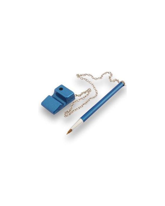Caracteristicas: - Caneta em alumínio tubolar, - Cor da Caneta e Suporte: Azul - com suporte para repouso na Horizontal - acabamento em pintura metálica, - corrente de 50 cm e fixação fita adesiva dupla face. - Fácil aplicação. - Marca : Caneta Fixa - Fabricante: Fejova - Carga Bic* ou similar. Fácil aplicação/troca. * As especificações podem ser alteradas sem aviso prévio ** Imagem meramente ilustrativa.