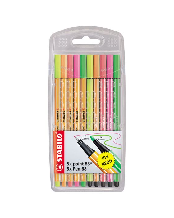 Caracteristicas:-A tradicional caneta Stabilo 88 e a 68 em um estojo super bonito com 5 cores de cada.-5 canetas 88 Caneta Extra fina traço 0,4mm,ideal para traços finos.-5 canetas 68 caneta ponta média traço 1.0mm-Tampa ventilada-Tinta a base de água -Alto rendimento-Longa duração-Secagem rápida.* As especificações podem ser alteradas sem aviso prévio ** Imagem meramente ilustrativa