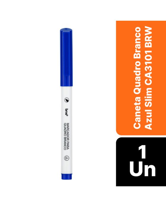 Características:- Desempenho e precisão para apresentações e anotações: A Caneta para Quadro Branco Azul Slim BRW CA3101 foi desenvolvida para garantir escrita suave, limpa e precisa em superfícies lisas como quadros brancos, vidros, metais e plásticos. Seu design fino e ergonômico proporciona conforto durante o uso prolongado, tornando-a ideal para salas de aula, escritórios e ambientes de treinamento.- Escrita macia e ponta resistente: Equipada com ponta redonda de acrílico de 1 mm, a caneta oferece traços uniformes e excelente controle na escrita, sem falhas ou interrupções. Sua ponta é resistente ao desgaste e não resseca facilmente, assegurando desempenho consistente e durabilidade prolongada.- Secagem rápida e fácil remoção: A tinta à base de água permite uma aplicação fluida e de secagem rápida, sendo facilmente apagada sem deixar resíduos ou manchas. Isso garante limpeza prática e reutilização constante do quadro sem perda de qualidade visual.- Aplicações e versatilidade: Ideal para uso em escolas, reuniões corporativas, treinamentos e apresentações, a caneta BRW Slim é uma ferramenta indispensável para profissionais e educadores que buscam clareza e praticidade na comunicação visual.- Sobre a marca BRW: Reconhecida pela qualidade e inovação em materiais de escritório e escolares, a BRW oferece produtos que unem praticidade, durabilidade e excelente custo-benefício. - Dimensões da embalagem: Comprimento: 13,6cm; Largura: 1,5cm; Altura: 1cm; Peso: 8g.ATENÇÃO! PRODUTO NÃO RECOMENDÁVEL PARA CRIANÇAS DE ATÉ 3 (TRÊS) ANOS POR CONTER PARTE(S) QUE PODE(M) SER ENGOLIDA(S) OU ASPIRADA(S).* As especificações podem ser alteradas sem aviso prévio ** Imagem meramente ilustrativa.
