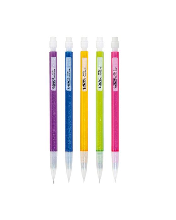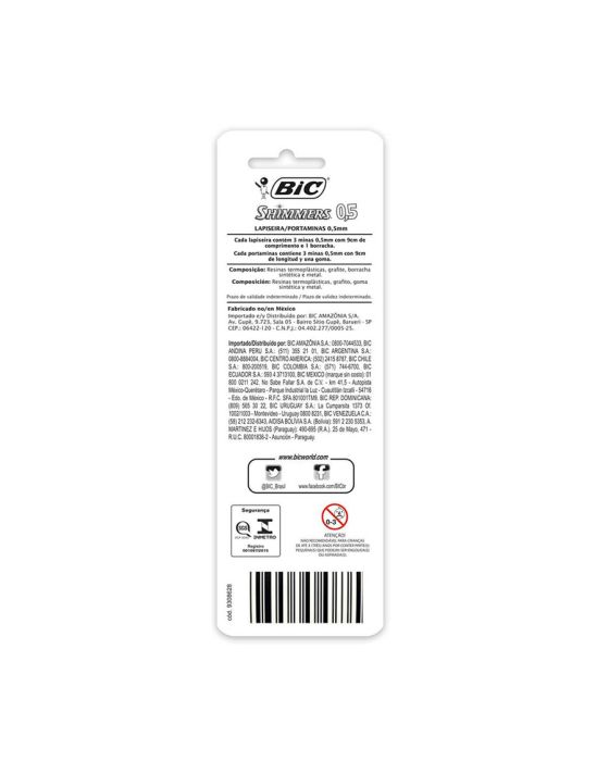 Caracteristicas:A lapiseira BIC Shimmers possui corpo em cores modernas com efeito brilhante e corpo hexagonal, proporcionando maior firmeza na escrita, escrita macia, grafite ultra resistente, não quebra com facilidade, com borracha na extremidade. Mais cor e diversão no seu dia a dia! Praticidade e confiança. É o que todo mundo quer ao adquirir um produto. E a BIC oferece isso em toda a sua linha!Detalhes:- Marca: Bic.- Modelo: Shimmers.- Linha: Lapiseira.- Cores: Roxa, amarela, azul claro, azul escuro, rosa, verde e laranja (cores blister sortida).- Contém: 1 blister com 3 unidades sortidos.- Grafite: 0.5mm.- Graduação: HB n°2.- Corpo hexagonal, colorido e translúcido.- Disponível em sete cores.- Possui 3 grafites de alta resistência por lapiseira.- Borracha branca na extremidade.Composição:- Resinas termopláticas, grafite, borracha sintética e metal.Atenção: Não recomendável para crianças de até 3 (três) anos por conter parte(s) a serem engolids(s) ou aspiradas(9a).Cores das capas sortidas, será enviado de acordo com a disponibilidade do estoque. Não é possível escolher uma cor específica.* As especificações podem ser alteradas sem aviso prévio ** Imagem meramente ilustrativa