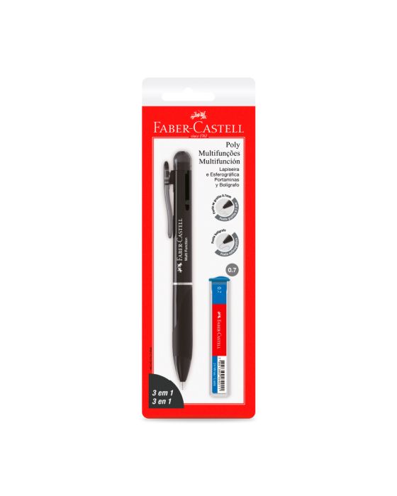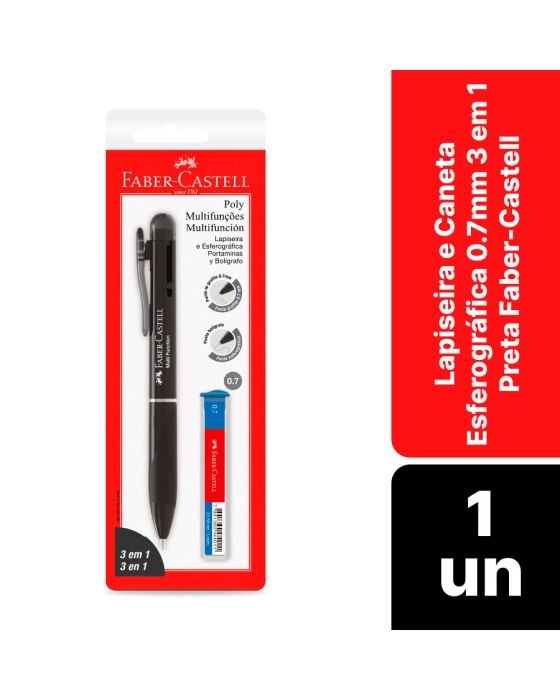 Características:Chegou a combinação que faltava! A Poly Multifunção é a junção de lapiseira 0.7mm com duas cores de caneta semi-gel azul e preta, com corpo preto.Detalhes:- Marca: Faber-Castell;- Modelo: Poly Multifunções;- Referência: SM/07L31PR;- Linha: Lapiseiras;- Cores: Preto;- Formato: Redondo;- Contém: 1 blister com 1 unidade do produto;- Ponta: 0.7mm;- Acompanha: 1 estojo grafite com 12 minas 0.7B;- Novidade: Esferográficas e lapiseiras juntas em um mesmo produto;- Uso: Profissional;- Caneta esferográfica com tinta semi-gel, maior fluidez e maciez;- Borracha no topo que permite maior praticidade de uso;- Versatilidade e possibilidades reunidas;- Produto atóxico.Fabricado na China | Validade: Indeterminada.Modo de uso:- Acione a caneta azul puxando o dispositivo azul para baixo;- Acione e caneta preta puxando o dispositivo preto para baixo;- Acione a lapiseira ao empurrar o clip para baixo;- Para adicionar o grafite, pressione repetidamente o clip para baixo.Armazenamento:- Evitar temperaturas acima de 45°C e exposição direta aos raios solares;- Armazenar em local seco e ventilado.Composição:- Resinas termoplásticas, ponta metálica, mola de aço inox, mina Polymer e borracha sintética.Medidas:- Dimensões da embalagem: 20,7 x 6,7 x 1,7cm (CxLxA);- Peso: 23g.ATENÇÃO! NÃO RECOMENDÁVEL PARA CRIANÇAS MENORES DE 3 (TRÊS) ANOS POR CONTER PARTE(S) PEQUENA(S) QUE PODE(M) SER ENGOLIDA(S) OU ASPIRADA(S) E PONTA(S) AGUDA(S) FUNCIONAL(IS). CRIANÇAS ENTRE 5 (CINCO) E 8 (OITO) ANOS SOMENTE DEVEM UTILIZAR SOBR SUPERVISÃO DE UM ADULTO.* As especificações podem ser alteradas sem aviso prévio ** Imagem meramente ilustrativa.
