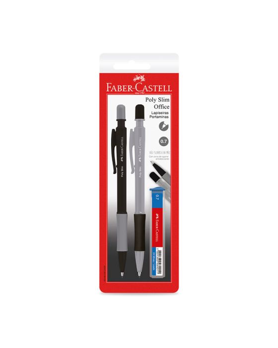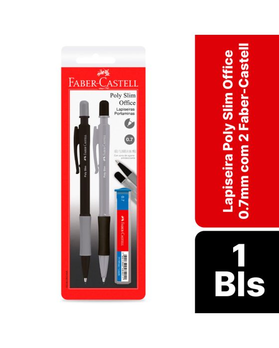 Características:- Instrumento de escrita preciso e ergonômico: A lapiseira Poly Slim Office Faber-Castell foi desenvolvida para proporcionar escrita técnica, precisa e confortável. Indicada para uso diário em ambientes corporativos, acadêmicos e profissionais, conta com grip emborrachado antiderrapante que garante firmeza ao segurar, evitando escorregões e promovendo maior controle durante o uso contínuo.- Ponta fina e grafite 0.7mm tipo B: Projetada com ponta metálica fina e resistente, a lapiseira utiliza grafite de 0.7mm tipo B, ideal para escrita suave e traços nítidos. - Conforto funcional com durabilidade: Equipada com borracha de alta performance na extremidade, protegida por tampa plástica, a lapiseira combina durabilidade com funcionalidade prática. O corpo leve e resistente, com visual moderno em preto e cinza, contribui para uma experiência de uso profissional e confortável.- Blister com 2 unidades e estojo de grafite: A embalagem inclui duas lapiseiras (1 preta com detalhes cinza e 1 cinza com detalhes pretos), além de um estojo com 12 grafites 0.7B, oferecendo excelente rendimento e performance prolongada.- Marca referência em qualidade: A Faber-Castell é reconhecida mundialmente por sua excelência na fabricação de instrumentos de escrita e desenho. Com tradição e inovação, a marca é sinônimo de qualidade, precisão e conforto.- Dimensões do produto:Comprimento: 14,7cm;Largura: 1,5cm;Altura: 1cm;Peso: 7g.- Dimensões da embalagem:Comprimento: 20,9cm;Largura: 6,6cm;Altura: 0,5cm;Peso: 10g.ATENÇÃO! PRODUTO NÃO RECOMENDÁVEL PARA CRIANÇAS DE ATÉ 4 (QUATRO) ANOS POR CONTER PARTE(S) QUE PODE(M) SER ENGOLIDA(S) OU ASPIRADA(S) E PONTA(S) AGUDA(S) FUNCIONAL(IS). CRIANÇAS 5 (CINCO) E 8 (OITO) ANOS SOMENTE DEVEM UTILIZAR SOB SUPERVISÃO DE UM ADULTO.* As especificações podem ser alteradas sem aviso prévio ** Imagem meramente ilustrativa.