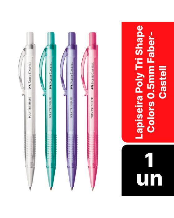 Características:A Lapiseira Tri Shape Colors da Faber-Castell possui cores super divertidas e o acionamento superior da mina de grafite. Seu corpo é triangular para maior conforto na escrita e possui borracha colorida com tampa protetora no topo da lapiseira. Ideal para utilizar o grafite 0.5mm.Detalhes:- Marca: Faber-Castell;- Modelo: Tri Shape Colors- Referência: LP05TSC;- Linha: Lapiseira;- Cores: Branca, Verde, Lilás e Rosa (Cores sortidas);- Grafite: 0,5mm;- Contém: 1 unidade do produto;- Corpo triangular: mais firmeza e conforto na escrita;- Borracha com tampa protetora;- Ponteira retrátil;- Produto não perecível e atóxico.Armazenamento:- Evitar temperaturas acima de 45°C e exposição direta aos raios solares;- Armazenar em local seco e ventilado;Composição:- Lapiseira: Resinas termoplásticas, ponta metálica, mola de aço, mina Polymer e borracha sintética.Medidas:- Dimensões do produto: 14 x 1,5 x 1,5cm (CxLxA).Cores sortidas, será enviado de acordo com a disponibilidade do estoque. Não é possível escolher uma cor específica.ATENÇÃO! NÃO RECOMENDÁVEL PARA CRIANÇAS MENORES DE 3 (TRÊS) ANOS POR CONTER PARTE(S) PEQUENA(S) QUE PODE(M) SER ENGOLIDA(S) OU ASPIRADA(S) E PONTA(S) AGUDA(S) FUNCIONAL(IS). CRIANÇAS ENTRE 5 (CINCO) E 8 (OITO) ANOS SOMENTE DEVEM UTILIZAR SOBR SUPERVISÃO DE UM ADULTO.* As especificações podem ser alteradas sem aviso prévio ** Imagem meramente ilustrativa.