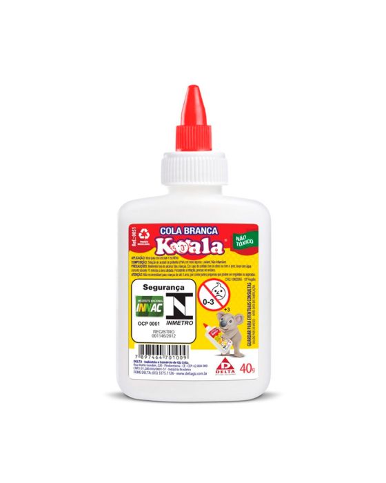 Caracteristicas:A Cola Branca Koala foi desenvolvida para uso escolar e artesanal, além de ser perfeita para SLIME. Com formatos variados, ela possui uma diversidade de aplicações, como em trabalhos escolares, colagem, etc. Produto atóxico.Detalhes:- Marca: Koala.- Linha: Cola Branca.- Peso Líquido: 40g.- Cor: Branca.- Lavável.- Não tóxica.- Produzida à base de PVA.- Indicada para uso escolar.Produto certificado pelo INMETRO.Onde aplicar:- A cola branca é um produto atoxico, pode ser usado para trabalhos de colagem em papel, papelão, couro etc.* As especificações podem ser alteradas sem aviso prévio ** Imagem meramente ilustrativa.