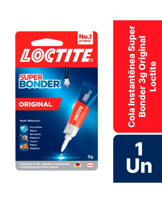 Caracteristicas:Loctite Super Bonder Original é um adesivo instantâneo, monocomponente de baixa viscosidade, universal de alta qualidade, transparente extraforte, fácil de usar, com força instantânea em uma única gota, usa a tecnologia de cianoacrilato que garante reparos invisíveis e duráveis. Adere rapidamente uma ampla variedade de materiais porosos e não poroso, como porcelana, metal, borracha, papel, madeira, cerâmica, plástico**, etcDesign funcional, projetado para aplicações rápidas, variadas e pontuais. Sua embalagem compacta é fácil de transportar em qualquer necessidade ou emergência. Super Bonder é resistente à umidade, como também ao choque e à temperatura. Loctite Super Bonder Original, transparente com adesão instantânea, embalagem 3g. - Resistente à altas e baixas temperaturas, à umidade e a impactos- Forças instantâneas- Alta performance- Bico anti-entupimento- Fórmula sem solventes- Cola universal de alta qualidade- Cola instantânea fácil de usar- Tripla resistência: temperatura, água e impacto** tecnologia hidrofóbicaOBS.: Não adere **plásticos à base de Polietileno, Polipropileno, PTFE (resina antiaderente), silicone e Isopor (marca KNAUF Isopor ltda)* As especificações podem ser alteradas sem aviso prévio ** Imagem meramente ilustrativa