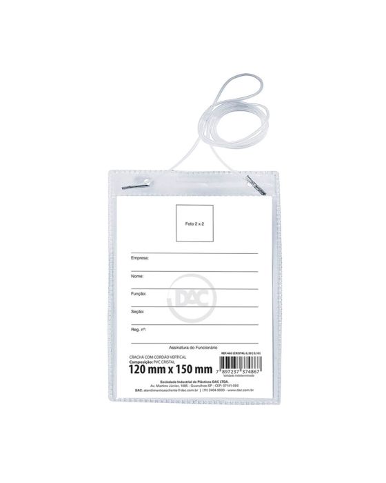 Características:Organize e promova eventos sem perder a identificação de todos envolvidas da equipe, funcionários, alunos e visitantes em eventos, feiras, convenções, empresas, hospitais, condomínios e outros.Detalhes:- Modelo: DAC;- Referência: 460- Linha: Crachás;- Cor: Transparente/Incolor;- Contém: 1 embalagem com 10 unidades do produto;- Formato: 12 x 15cm;- Espessura: 0,10 (Frente) e 0,30 (Verso);- Possui cordão transparente em silicone.Validade: Indeterminada.Onde usar:- Ideal para eventos, congressos, escolas e cursos, hospitais e demais ambientes que necessite de indentificação.Campos de informações:- Espaço para foto 2 x 2;- Nome da empresa;- Nome;- Função;- Seção;- Número de registro;- Assinatura do funcionário.Composição:- PVC Cristal.* As especificações podem ser alteradas sem aviso prévio ** Imagem meramente ilustrativa.