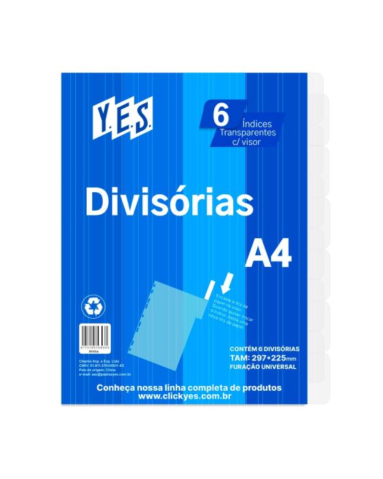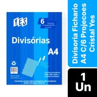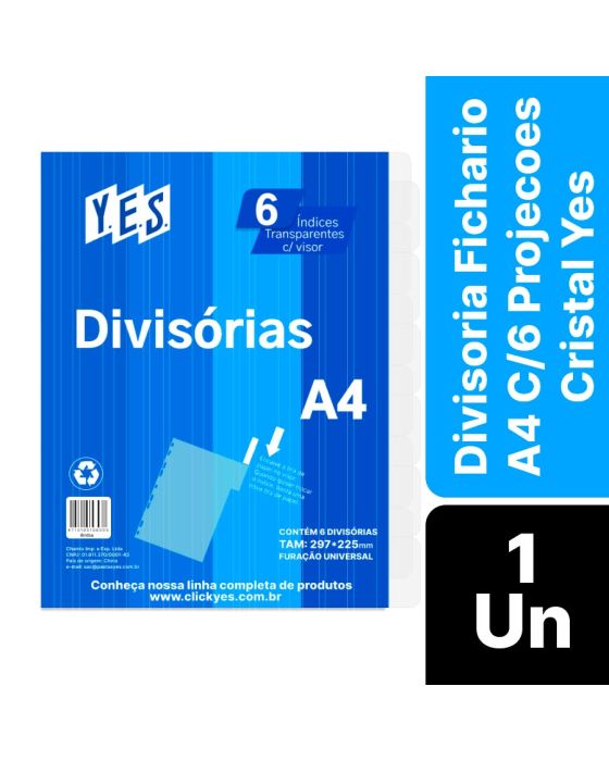 Características:Ideal para organizar e identificar matérias escolares, documentos em fichários e pastas. Feito de polipropileno de alta qualidade, totalmente reciclável e durávelDetalhes:- Marca: Y.E.S;- Fabricante: Chamix;- Referência: 6INTBA;- Linha: Divisórias Fichário;- Cor: Cristal;- Tamanho: A4;- QWuantidade de divisórias: 6;- Contém: 1 embalagem do produto com 6 divisórias;- Acompanha etiquetas de identificação;- Acompanha índices coloridos personalizáveis para identificação- Divisórias com visor. furação universal;- Compatível com todos os tipos de arquivos com ferragem de 2, 3 e 4 argolas;- Produto 100% reciclável;- Não adere ao impresso.Material:- Composição: Polipropileno de alta resistência e transparência.Medidas- Dimensões do produto: 230 x 295 mm(230 x 295cm).- Peso: 80 g * As especificações podem ser alteradas sem aviso prévio ** Imagem meramente ilustrativa