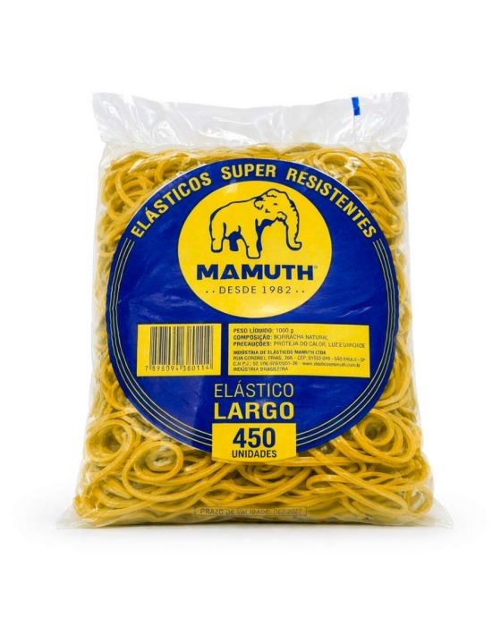 Características:- Elástico largo em borracha natural com alta resistência e uso versátil para organização e fixação: O Elástico Largo 1000g Mamuth foi desenvolvido para proporcionar fixação segura e durável em diversas aplicações. Produzido em borracha natural na cor amarela, oferece alta elasticidade e resistência, mantendo sua eficiência mesmo em uso contínuo e repetitivo.- Praticidade no uso com grande quantidade e aplicação imediata: Fornecido em pacote de 1000g com aproximadamente 450 unidades, atende demandas operacionais com excelente rendimento. Ideal para uso frequente em ambientes corporativos, comerciais e domésticos, facilitando a organização de materiais.- Alta resistência com elasticidade consistente e durabilidade prolongada: Possui espessura de aproximadamente 0,5 cm, garantindo maior robustez em comparação a elásticos convencionais. Sua composição em borracha natural proporciona alongamento eficiente sem perda rápida de tensão, assegurando maior vida útil.- Indicado para organização, fixação e agrupamento de materiais: Recomendado para agrupar documentos, pastas, cédulas, materiais escolares, além de aplicações em embalagens, amarração de cargas leves e uso geral. Ideal para escritórios, comércios, indústrias e uso doméstico.- Sobre a marca Mamuth: A Mamuth é uma indústria brasileira reconhecida pela produção de elásticos de borracha com foco em resistência, qualidade e desempenho.- Dimensões da embalagem: Comprimento: 27,5cm; Largura: 21,5cm; Altura: 7,5cm; Peso: 1kg. * As especificações podem ser alteradas sem aviso prévio ** Imagem meramente ilustrativa.