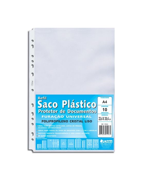 Caracteristicas:-Possui furação universal e banda de reforço, servindo para todos os tipos de arquivos c/ferragem de 2, 3 e 4 argolas. -Perfeita Transparência e sem aderência ao papel, 100% reciclável.-Ideal para pastas Catálogos, listas de preços, arquivos, etc. -Fácil reposição e manuseio - Embalagem com 10 undidades -Produzido c/ Plástico especial (Polipropileno - Cristal), Anti-Reflexo, o impresso não gruda no plástico com o calor e também não risca-Tamanho: 23,4 x 30,4 cm-espessura 55 micras* As especificações podem ser alteradas sem aviso prévio ** Imagem meramente ilustrativa.