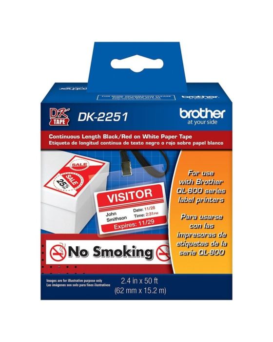 Características:Possui impressão em vermelho e preto, com fundo branco, sendo uma ótima opção para crachás, avisos, etiquetas de identificação, entre outros.- Tamanho: A fita DK 2251 possui 62mm de largura por 15.2m de comprimento, sendo um modelo versátil e econômico.- Para Impressora Brother QL570/QL580/QL550/QL650TD/QL700/QL800/QL810W/QL1050/QL1050N/QL1060N* As especificações podem ser alteradas sem aviso prévio ** Imagem meramente ilustrativa