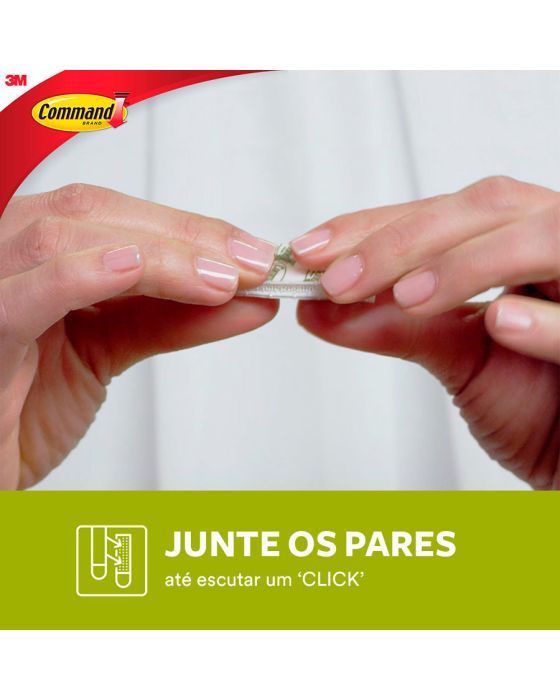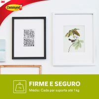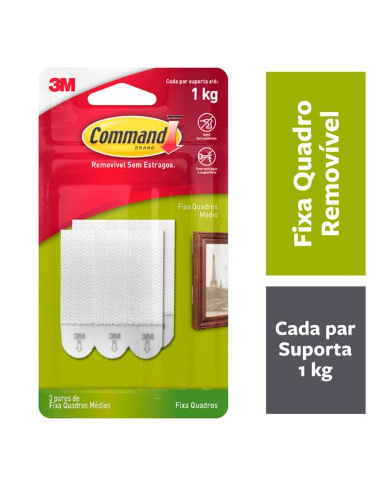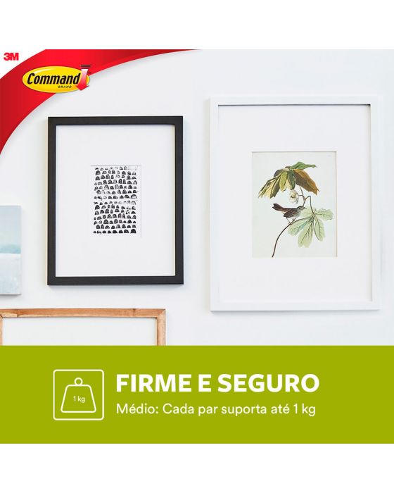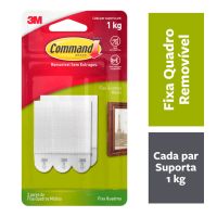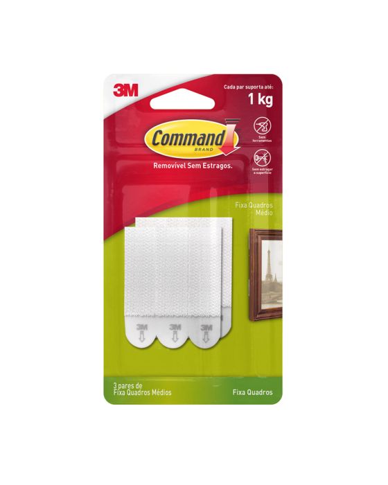 Características:O Fixa Quadros Adesivo 3M™ Command® é a solução ideal para pendurar quadros e decorar a casa de forma prática, sem sujeira e sem furos na parede. Faça você mesmo em minutos e remova quando quiser, sem estragar sua parede.Detalhes:- Marca: Command™;- Fabricante: 3M™;- Referência: H0002316828;- Cor: Branco;- Tamanho: Médio;- Contém: 1 embalagem do produto com 3 Pares do produto;- Suporta até: cada fecho suporta até 1kg;- Podem ser utilizados em áreas úmidas e diversas outras superfícies;- Sem ferramentas, fácil de aplicar e remover;- Removível sem estragos, ao ser removido não deixa adesivo nem danifica a parede.Aplicação:- É indicado para decoração fácil e rápida sem causar danos na parede.Como Usar:- Limpe a superfície somente com álcool líquido sem fragrância e deixe secar por 10 minutos;- Destaque uma tira adesiva e remova a sua fita protetora vermelha. Aplique a tira adesiva com a lingueta para baixo no gancho;- Remova a fita protetora preta e pressione o gancho contra a superfície por 30 segundos;- Deslize para cima a peça frontal do gancho e remova-a. Pressione firmemente a base do gancho por 30 segundos. Encaixe a peça frontal de volta na base;- Espere 1 hora e pendure seu objeto no gancho.Como Remover:- Deslize para cima a peça frontal do gancho e remova-a;- Com uma mão, segure o base do gancho sem pressionar a parede;- Com a outra mão, puxe lentamente a lingueta para baixo, paralelo à parede, até a tira adesiva se desprender da superfície. Atenção: Nunca puxe a lingueta em sua direção.Composição:- Liner: Papel;- Gancho: Fecho polipropileno e propileno/etileto e fita adevia em polietileno;- Adesivo: Poliúria de Silicone.Recomendação:- Não se recomenda usá-los em cortiças, painéis de gesso, papel de parede e paredes com acabamentos.Conteúdo da embalagem: 1 Fecho Command Branco Medio 3m.* As especificações podem ser alteradas sem aviso prévio ** Imagem meramente ilustrativa.
