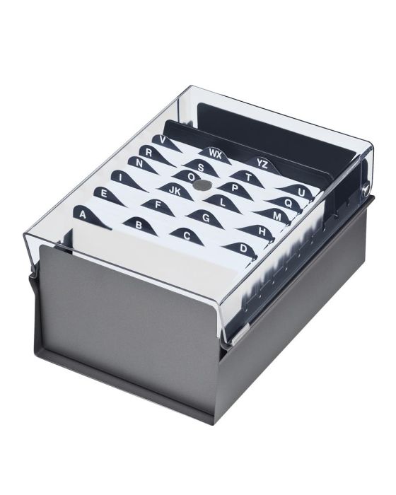 Carcateristicas:- Base metálica com tampa em poliestireno- Medida: 162 x 118 x 240 mm- Não acompanha índice, nem ficha- Possui capacidade para até 500 fichas tamanho 4 x 6- Contém 1 divisória de plástico para auxiliar equilíbrio dos cartões no fichário.* As especificações podem ser alteradas sem aviso prévio ** Imagem meramente ilustrativa