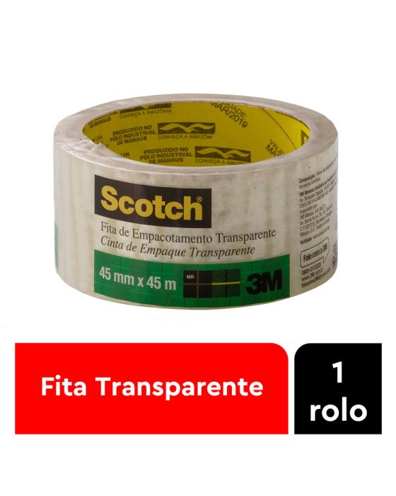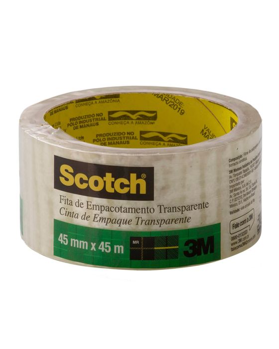 Características:Com filme 10% mais grosso e 10 vezes mais adesão do que fitas comuns, a Fita Adesiva Scotch® possui desenrolamento leve e é fácil de manusear. É ideal para utilização em caixas mais leves e uso geral.Detalhes:- Marca: Scotch®;- Modelo: Fita de Empacotamento Scotch® Hot Melt;- Referência: HB004031199;- Linha: Fitas Adesivas;- Cor: Transparente;- Contém: 1 unidade do produto;- Tamanho: 4,5cm x 45m (Largura (Métrica) x Comprimento);- Filme 10% mais grosso que garante maior resistência;- Fácil manuseio, pois têm tecnologia que ajuda a fita a desenrolar mais facilmente;- Adesão 10 vezes maior do que outros adesivos, o qual aumenta após a aplicação, devido a seu adesivo Hot Melt;- Garante tranquilidade, pois seu embrulho chegará fechado ao destino.Onde aplicar:- Ideal para fechar sua caixa ou envelope com máxima segurança.Composição:- Base de resina e Borracha sintética.Medidas:- Dimensões: 4,5 x 9,5 x 9,5cm (AxLxC);- Peso: 359g.* As especificações podem ser alteradas sem aviso prévio ** Imagem meramente ilustrativa.