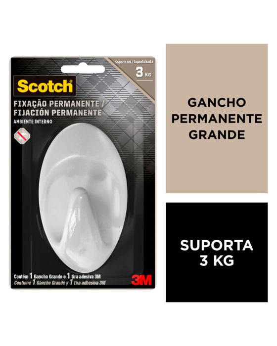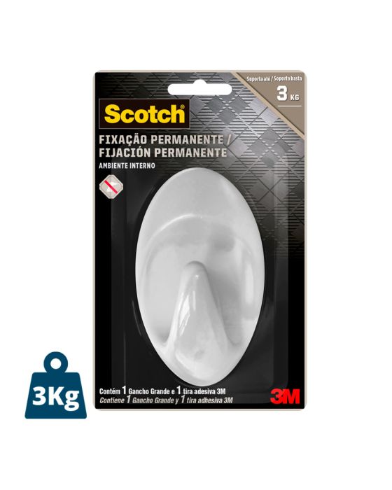 Características:- Gancho adesivo grande com fixação permanente e design moderno: O Gancho Scotch Grande Branco 3M foi desenvolvido para oferecer uma solução prática e permanente para organização de ambientes internos. Seu design moderno e acabamento em poliestireno branco garantem integração visual com paredes, portas e mobiliários, mantendo resistência mecânica para uso contínuo.- Instalação sem ferramentas para organização rápida: O sistema adesivo à base de borracha sintética elimina o uso de pregos ou parafusos, permitindo instalação limpa, rápida e sem danos à superfície. Basta remover o liner protetor, aplicar na área desejada e aguardar a cura completa do adesivo para obter fixação definitiva.- Suporte de até 3 kg para objetos do dia a dia: Projetado para uso doméstico, corporativo e institucional, o gancho suporta até 3 kg, sendo indicado para pendurar acessórios, bolsas leves, toalhas, utensílios, aventais, fones, cabos ou itens de uso recorrente. Suas dimensões de 11,5 × 6,5 × 6 cm garantem boa área de apoio e estabilidade.- Aplicação em paredes internas e superfícies lisas: O produto é ideal para superfícies planas e lisas, como azulejos, madeira pintada, MDF, vidro e paredes com acabamento uniforme. É recomendado para cozinhas, escritórios, áreas de serviço, corredores, salas e ambientes onde seja necessário reorganizar ou otimizar espaço sem intervenções estruturais.- Sobre a marca 3M: A 3M é referência mundial em soluções adesivas, organização e produtos técnicos para uso profissional e doméstico.- Dimensões do produto: Comprimento: 17,5cm; Largura: 11cm; Altura: 5cm; Peso: 55g.* As especificações podem ser alteradas sem aviso prévio ** Imagem meramente ilustrativa.
